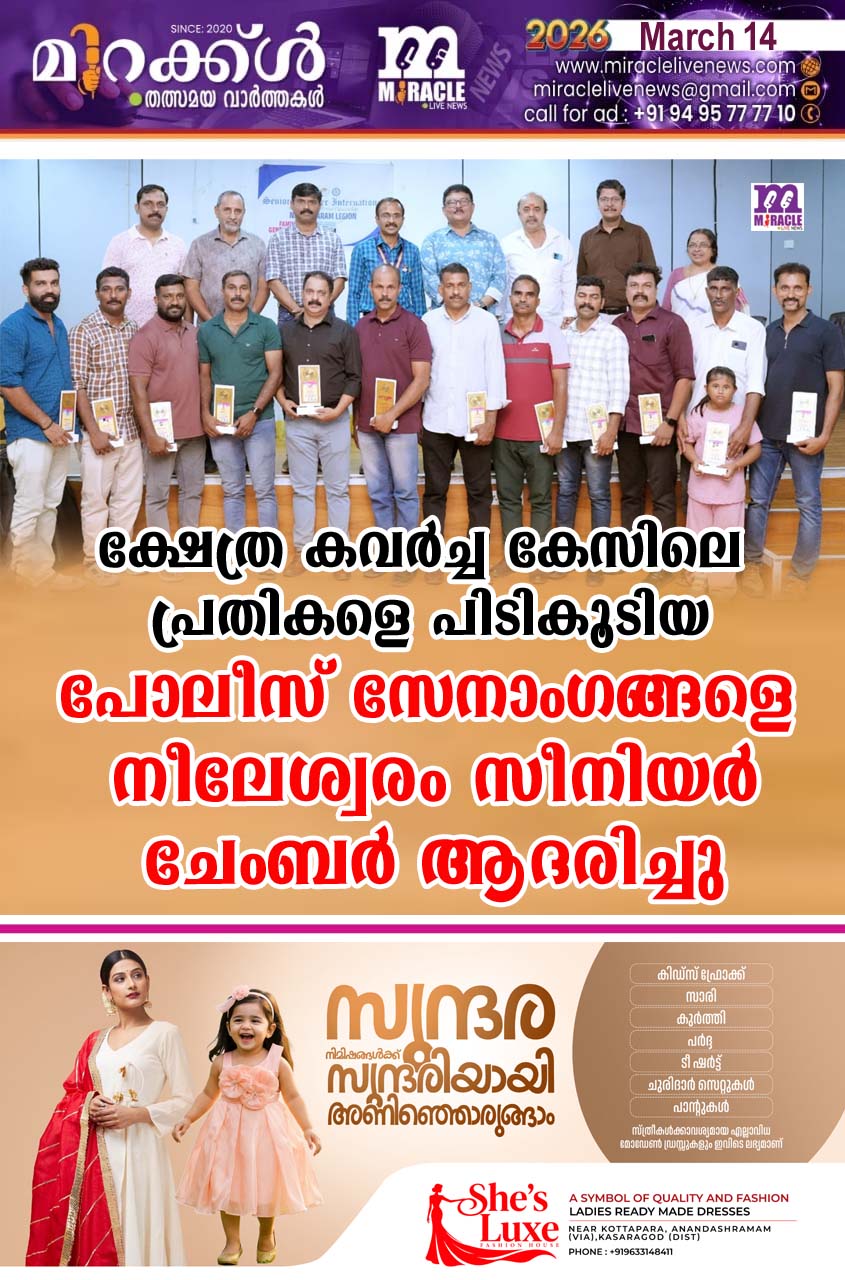 നീലേശ്വരം : നീലേശ്വരത്തെ ക്ഷേത്രങ്ങളില് കവര്ച്ച നടത്തിയ പ്രതികളെ വളരെ ചുരുങ്ങിയ ദിവസങ്ങള്ക്കുള്ളില് പിടികൂടിയ പോലീസ് സേനാംഗങ്ങളെ സീനിയര് ചേംബര് ഇന്റര്നാഷണല് നീലേശ്വരം ആദരിച്ചു. പടന്നക്കാട് റിവര് വ്യൂ ഓഡിറ്റോറിയത്തില് വെച്ച് നടന്ന പരിപാടിയില് ചലച്ചിത്ര താരവും കാസര്കോട് വിജിലന്സ് ഡി…