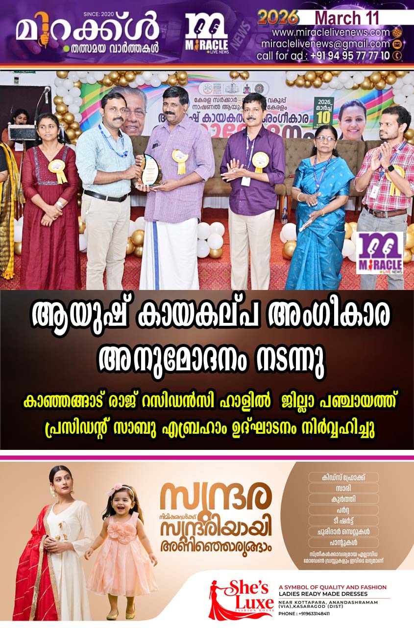 ആയുഷ് കായകല്പ അംഗീകാര അനുമോദനം നടന്നു; കാഞ്ഞങ്ങാട് രാജ് റസിഡന്സി ഹാളില് ജില്ലാ പഞ്ചായത്ത് പ്രസിഡന്റ് സാബു എബ്രഹാം ഉദ്ഘാടനം നിര്വ്വഹിച്ചു