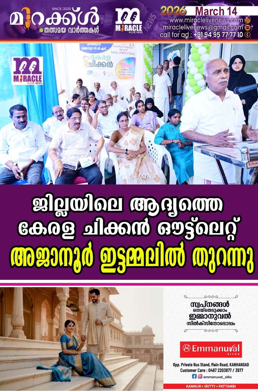 കാഞ്ഞങ്ങാട്:വര്ദ്ധിച്ചുവരുന്ന ഇറച്ചിക്കോഴി വിലക്ക് പരിഹാരം കണ്ടെത്തുന്നതിനും ,ശുദ്ധവും,പോഷകപ്രദവുമായ യോഴിയിറച്ചി ഉപഭോക്താക്കള്ക്ക് ലഭ്യമാക്കുന്നതിനും ആയി സംസ്ഥാന സര്ക്കാര് കുടുംബശ്രീ മുഖേനെ നടപ്പിലാക്കുന്ന…