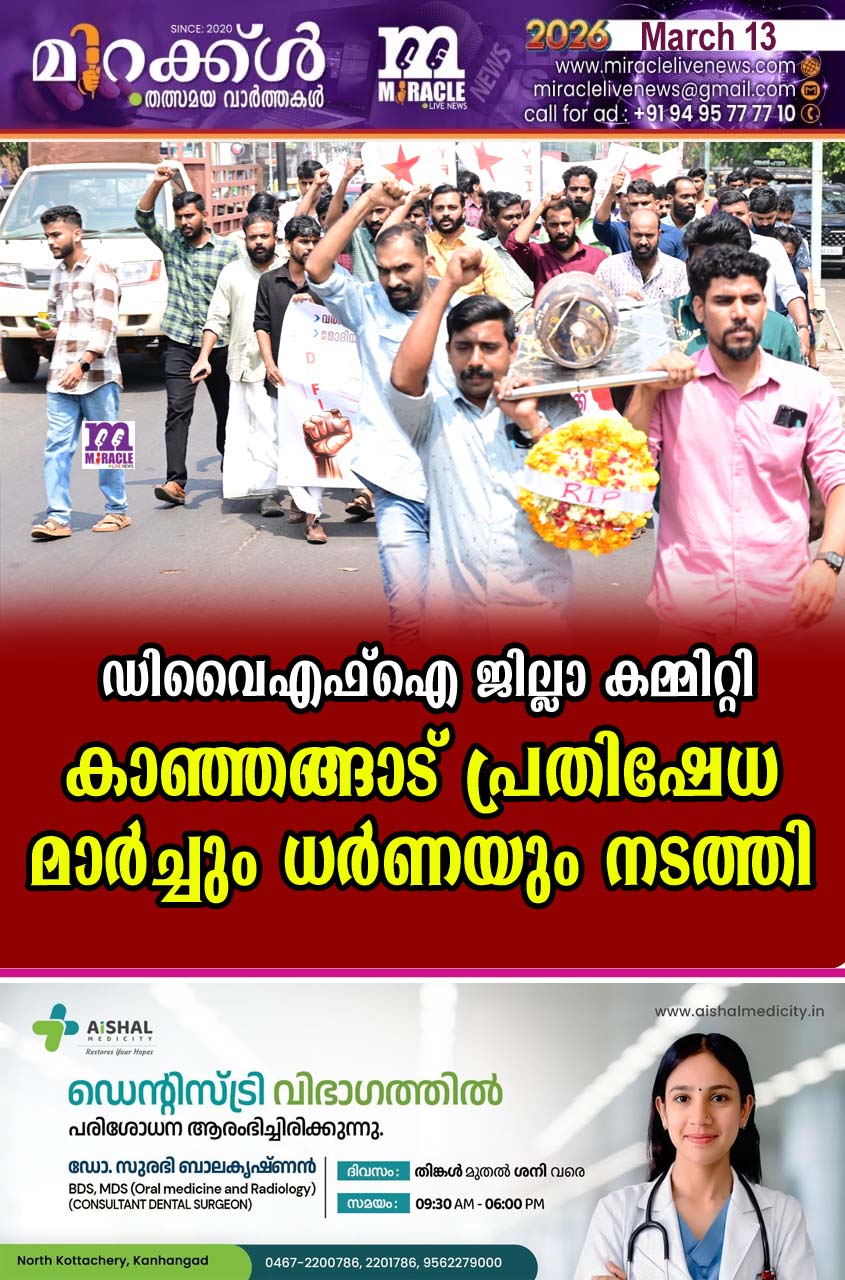 ഡിവൈഎഫ്ഐ ജില്ലാ കമ്മിറ്റി കാഞ്ഞങ്ങാട് പ്രതിഷേധ മാര്ച്ചും ധര്ണയും നടത്തി