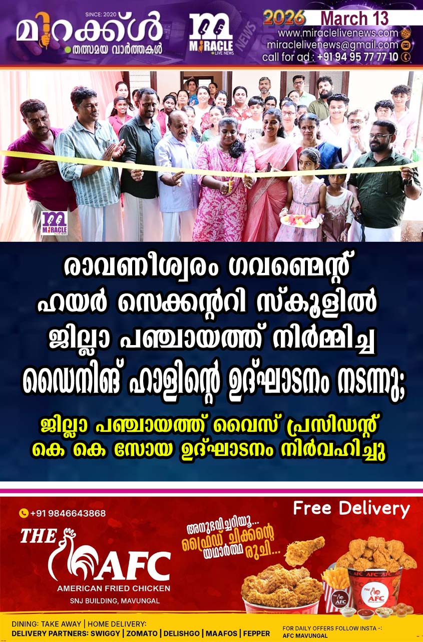 രാവണീശ്വരം ഗവണ്മെന്റ് ഹയര്സെക്കന്റ്റി സ്കൂളില് ജില്ലാ പഞ്ചായത്ത് നിര്മ്മിച്ച ഡൈനിങ്ഹാളിന്റെ ഉദ് ഘാടനം നടന്നു; ജില്ലാ പഞ്ചായത്ത് വൈസ് പ്രസിഡന്റ് കെ കെ സോയ ഉദ്ഘാടനം നിര്വഹിച്ചു