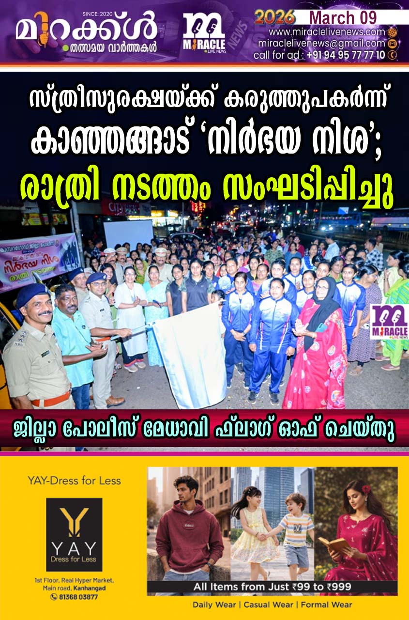 സ്ത്രീസുരക്ഷയ്ക്ക് കരുത്തുപകര്ന്ന് കാഞ്ഞങ്ങാട് ‘നിര്ഭയ നിശ’; രാത്രി നടത്തം സംഘടിപ്പിച്ചു; ജില്ലാ പോലീസ് മേധാവി ഫ്ലാഗ് ഓഫ് ചെയ്തു