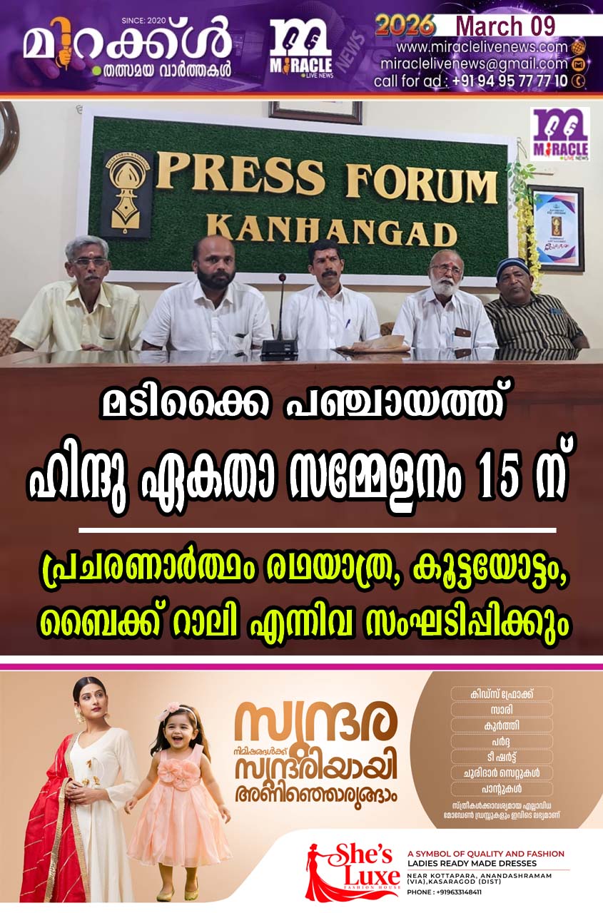 മടിക്കൈ പഞ്ചായത്ത് ഹിന്ദു ഏകതാ സമ്മേളനം 15 ന്; പ്രചരണാര്ത്ഥം രഥയാത്ര, കൂട്ടയോട്ടം, ബൈക്ക് റാലി എന്നിവ സംഘടിപ്പിക്കും