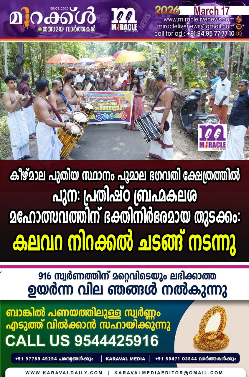 കീഴ്മാല പുതിയ സ്ഥാനം പൂമാല ഭഗവതി ക്ഷേത്രത്തില് പുന: പ്രതിഷ്ഠ ബ്രഹ്മകലശ മഹോത്സവത്തിന് ഭക്തിനിര്ഭരമായ തുടക്കം: കലവറ നിറക്കല് ചടങ്ങ് നടന്നു