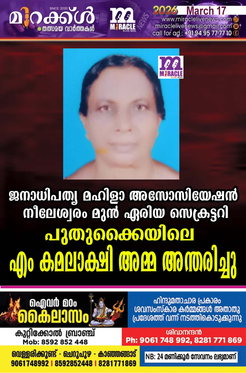 ജനാധിപത്യ മഹിളാ അസോസിയേഷന് നീലേശ്വരം മുന് ഏരിയ സെക്രട്ടറി പുതുക്കൈയിലെ എം കമലാക്ഷി അമ്മ അന്തരിച്ചു