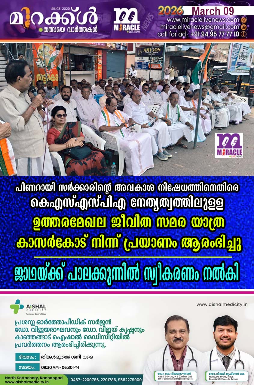 പിണറായി സര്ക്കാരിന്റെ അവകാശ നിഷേധത്തിനെതിരെ കെഎസ്എസ്പിഎ നേതൃത്വത്തിലുളള ഉത്തരമേഖല ജീവിത സമര യാത്ര കാസര്കോട് നിന്ന് പ്രയാണം ആരംഭിച്ചു. ജാഥയ്ക്ക് പാലക്കുന്നില് സ്വീകരണം നല്കി