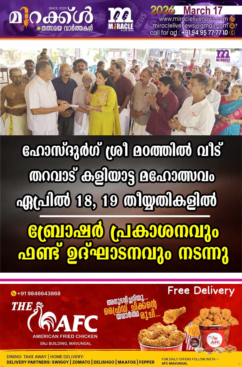 കാഞ്ഞങ്ങാട്: ഹോസ്ദുര്ഗ് മഠത്തില് വീട് തറവാട്ടില് ഏപ്രില്18.19 തീയതികളില് നടക്കുന്ന കളിയാട്ടത്തിന്റെ ആദ്യ ഫണ്ട് ഉദ്ഘാടനവും ബ്രോഷര് പ്രകാശനവും സംക്രമപൂജ ദിനത്തില് തറവാട്ടില് വെച്ചു നടന്നു. മാതൃസമിതി സെക്രട്ടറി അനിത ലിനീഷില് നിന്നും മഠത്തില് വീട് തറവാട് രക്ഷധികാരിയും റിട്ട:വില്ലജ് ഓഫീസറുമായ…