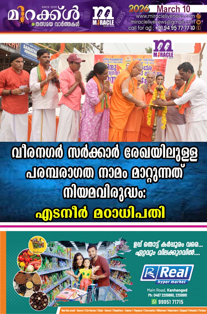 നീലേശ്വരം : തളിയില് ശ്രീ നീലകണ്ഠേശ്വര ക്ഷേത്രത്തിലെ കൊടിമരത്തിന് കീഴില് കാര്യംപറ അവകാശിയും പടിഞ്ഞാറ്റംകൊഴുവല് പള്ളിയത്ത് ഉന്പ്പിലാടത്ത് തറവാട് കാരണവരുമായ…
