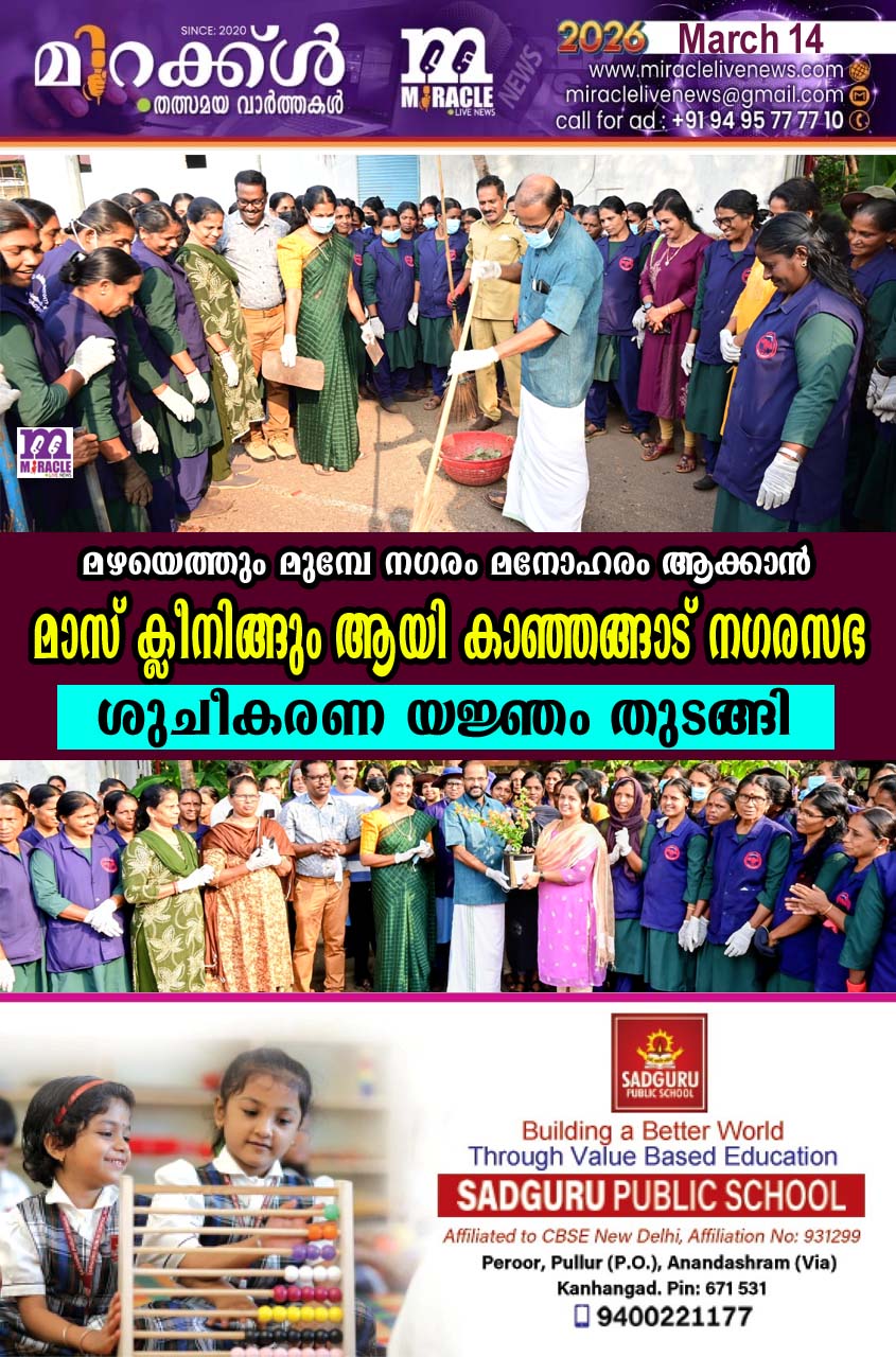 മഴയെത്തും മുമ്പേ നഗരം മനോഹരം ആക്കാന് മാസ് ക്ലീനിങ്ങും ആയി കാഞ്ഞങ്ങാട് നഗരസഭ ശുചീകരണ യജ്ഞം തുടങ്ങി