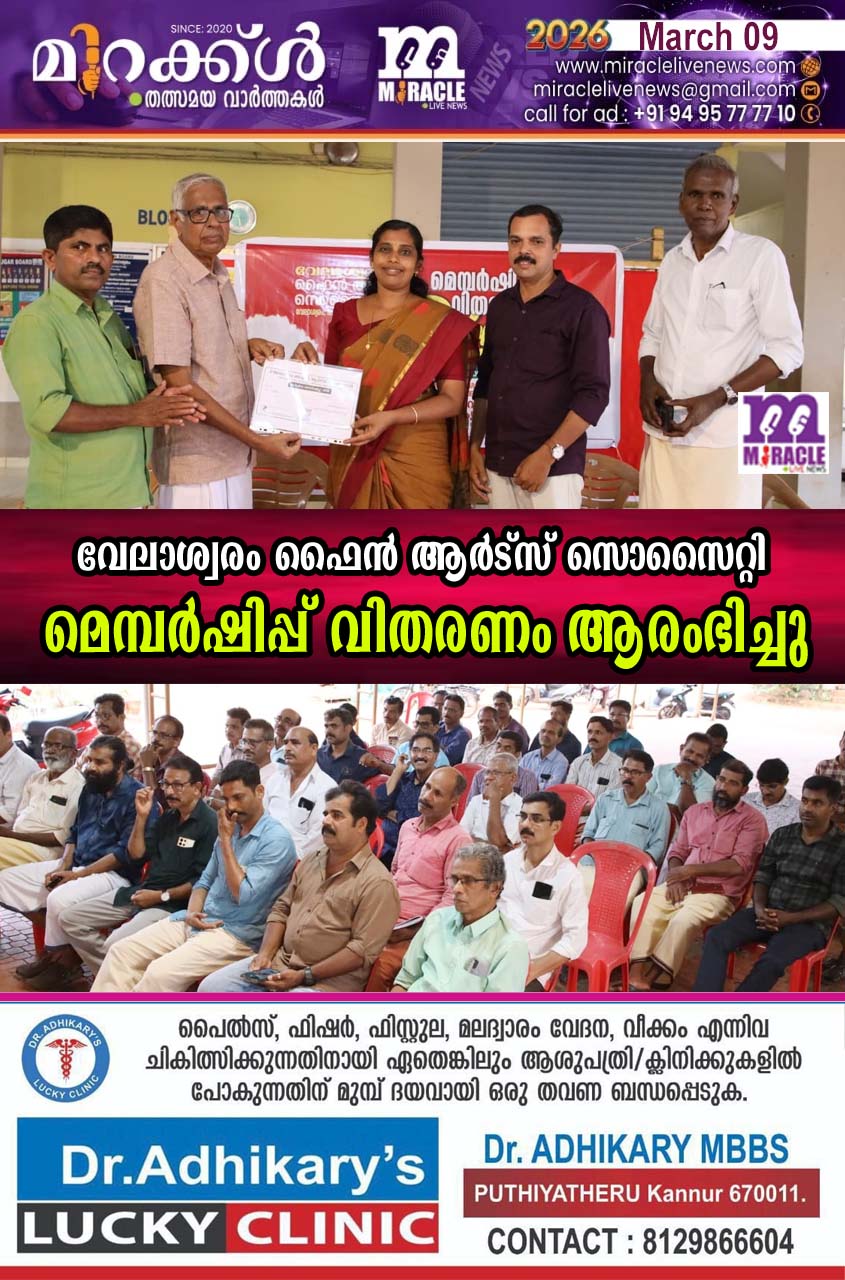 വേലാശ്വരം ഫൈന് ആര്ട്സ് സൊസൈറ്റി മെമ്പര്ഷിപ്പ് വിതരണം ആരംഭിച്ചു