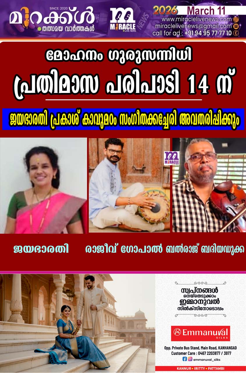 കോട്ടപ്പാറ: കൊടവലം മോഹനം ഗുരുസന്നിധി പ്രതിമാസ പരിപാടി മാര്ച്ച് 14 ന് 3 മണിക്ക് നടക്കും. ജയഭാരതി പ്രകാശ് കാവുമഠം സംഗീതക്കച്ചേരി അവതരിപ്പിക്കും വയലിനില് ബല്രാജ് ബദിയഡുക്കയും മൃദംഗത്തില് രാജീവ് ഗോപാല് ബെള്ളിക്കോത്തും പക്കമേളമൊരുക്കും.