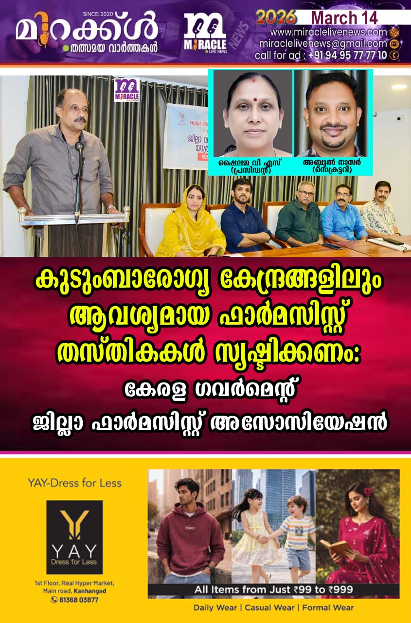 കാഞ്ഞങ്ങാട്: എല്ലാ കുടുംബാരോഗ്യ കേന്ദ്രങ്ങളിലും ആവശ്യമായ ഫാര്മസിസ്റ്റ് തസ്തികകള് സൃഷ്ടിക്കണമെന്നും, ഫാര്മസി നിയമങ്ങള് ശക്തമായി നടപ്പിലാക്കണമെന്നും കേരള ഗവര്മെന്റ് ഫാര്മസിസ്റ്റ്…