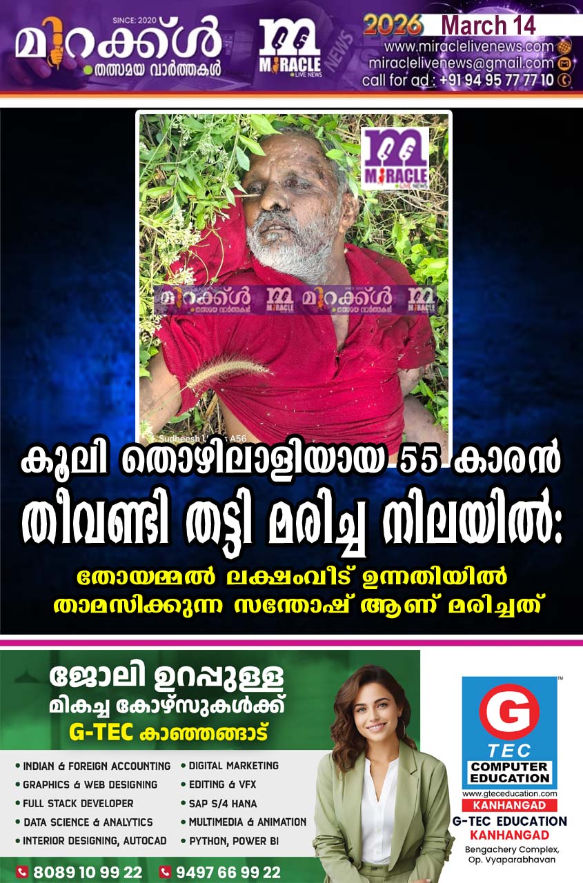 കൂലി തൊഴിലാളിയായ 55 കാരന് തീവണ്ടി തട്ടി മരിച്ച നിലയില്; തോയമ്മല് ലക്ഷംവീട് ഉന്നതിയില് താമസിക്കുന്ന സന്തോഷ് ആണ് മരിച്ചത്