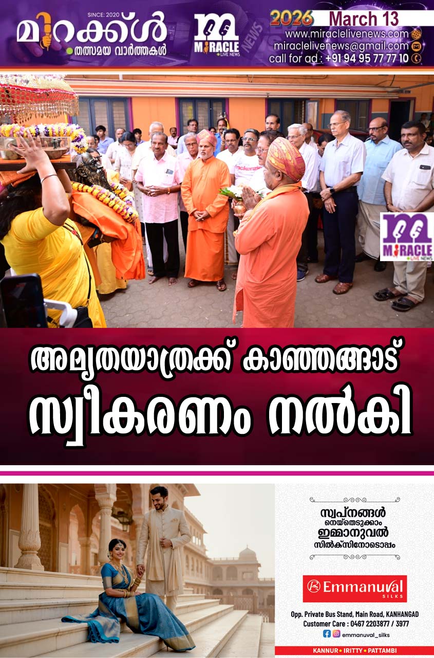 കാഞ്ഞങ്ങാട്: ചിന്മയ മിഷന്റെ 75ാം വാര്ഷികത്തിന്റെ ഭാഗമായി ചിന്മയ യുവകേന്ദ്ര സംഘടിപ്പിക്കുന്ന അമൃതയാത്രയ്ക്ക് കാഞ്ഞങ്ങാട് ചിന്മയ വിദ്യാലയത്തില് പൂര്ണകുംഭ സ്വീകരണം നല്കി. പുനെയില് ആരംഭിച്ച അമൃതയാത്ര നാലു സംസ്ഥാനങ്ങള് കടന്ന് 72ാം ദിവസമാണ് കാഞ്ഞങ്ങാട് എത്തിയത്. ചിന്മയാനന്ദ സ്വാമിയുടെ ദര്ശനങ്ങള് പ്രചരിപ്പിക്കുക,…