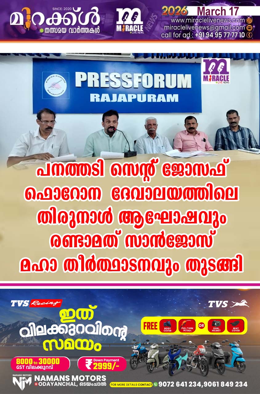 രാജപുരം: വിശുദ്ധ യൗസേപ്പിതാവിന്റെ നാമധേയത്തിലുള്ള കാസര്കോട് ജില്ലയിലെ സ്ഥിരം തീര്ത്ഥാടന കേന്ദ്രമായ പനത്തടി സെന്റ് ജോസഫ് ഫൊറോനദേവാലയത്തിലെ തിരുനാള് ആഘോഷവും…