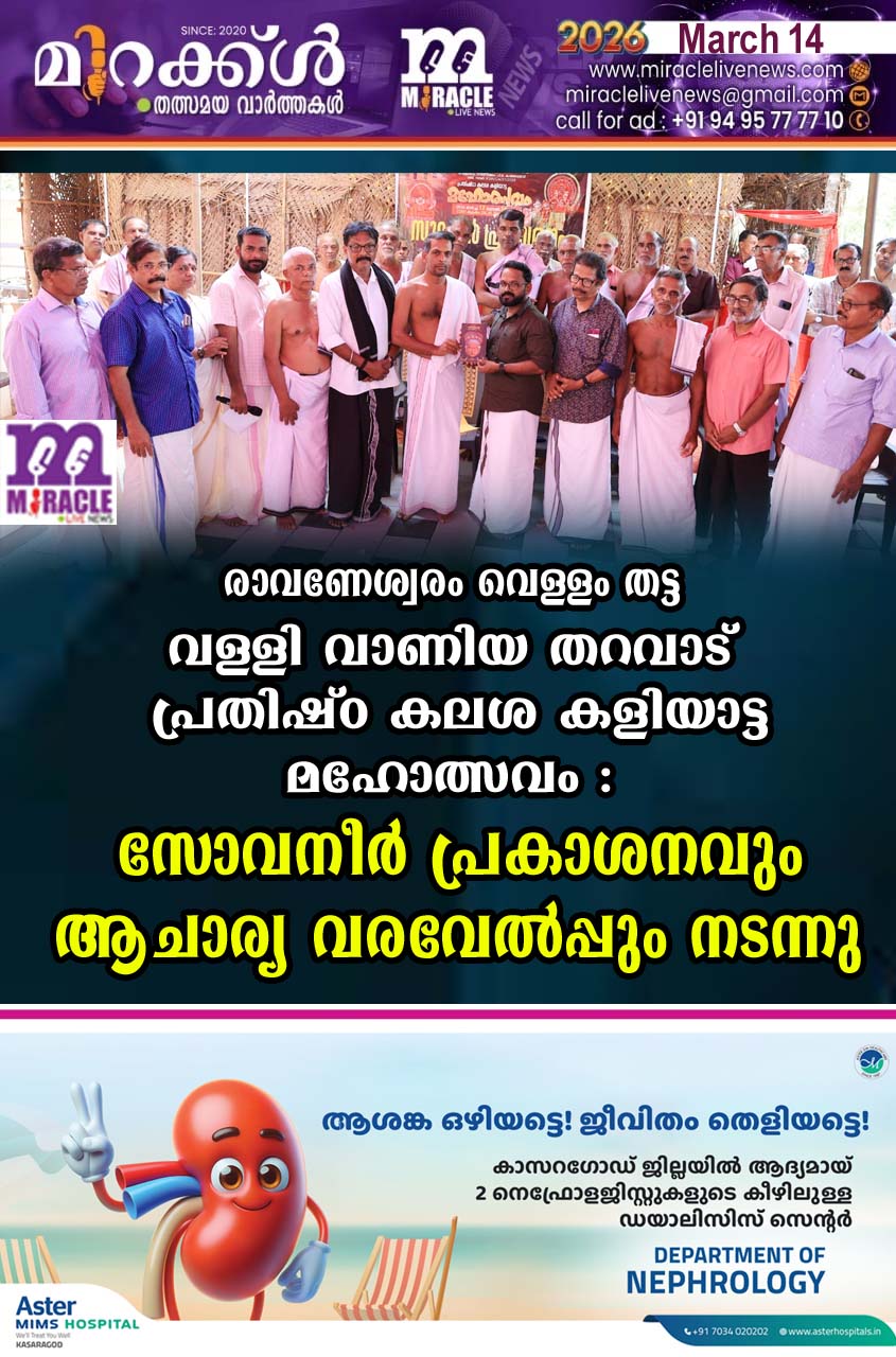 രാവണേശ്വരം വെള്ളം തട്ട വള്ളി വാണിയ തറവാട് പ്രതിഷ്ഠ കലശ കളിയാട്ട മഹോത്സവം : സോവനീര് പ്രകാശനവും ആചാര്യ വരവേല്പ്പും നടന്നു