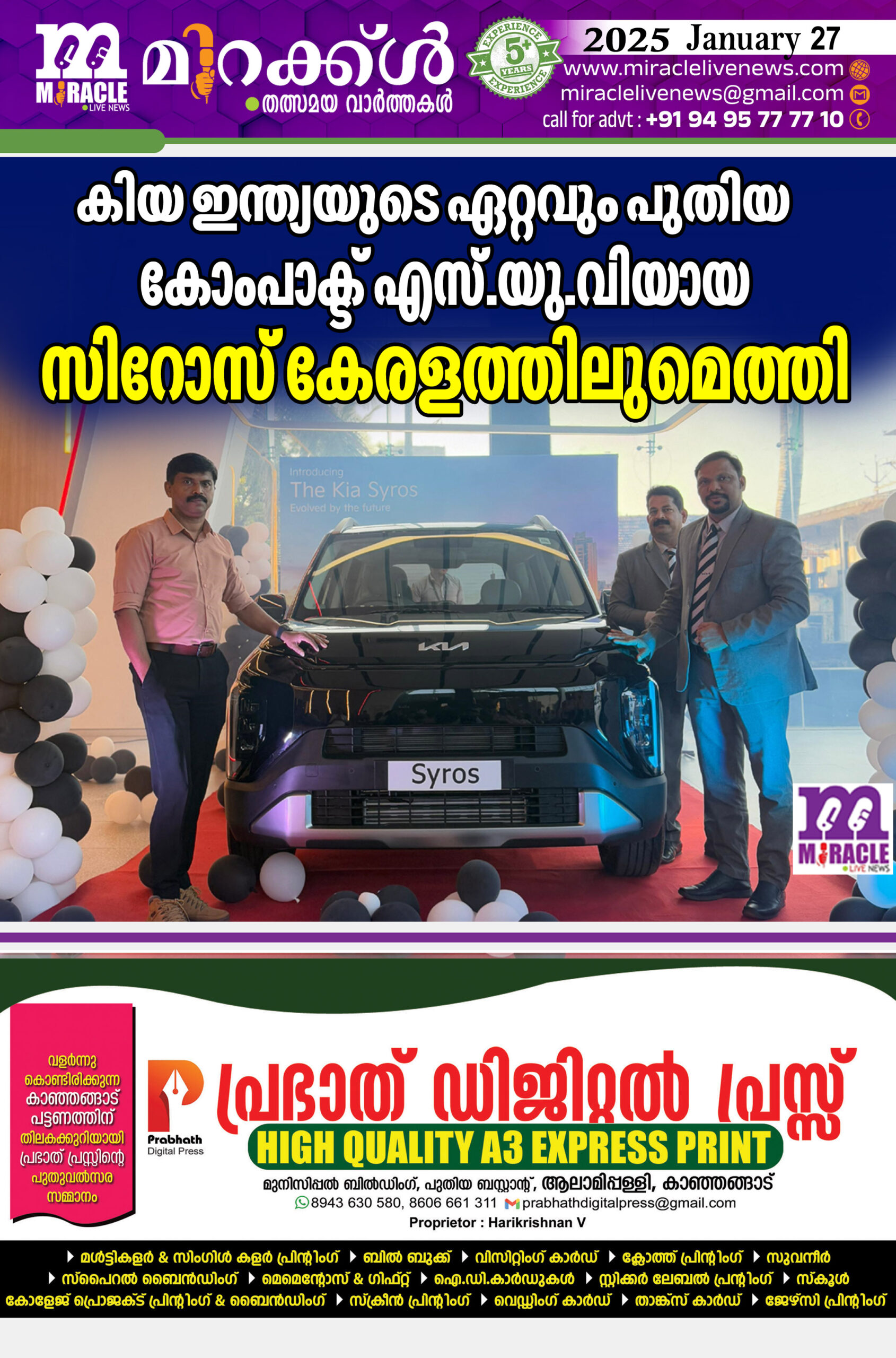 കണ്ണൂര് – കാസര്കോട് ഡി. കെ എച്ച് കിയയുടെ ഷോറൂമുകളിലായി നടന്ന ചടങ്ങില് കണ്ണൂര് ഡി. കെ. എച്ച് കിയയില് പ്രശസ്ത സിനിമാ താരവും മികച്ച ബാലനടനുള്ള ദേശീയ പുരസ്കാര ജേതാവുമായ മാസ്റ്റര് ശ്രീപത് യാന് ആയിരുന്നു പുതിയ മോഡല് അവതരിപ്പിച്ചത്. കാസര്കോട് നടന്ന ചടങ്ങില് പ്രശസ്ത സിനിമാ താരവും ഡി. വൈ. എസ്. പി യുമായ സിബി തോമസ് ആണ് പുതിയ മോഡല് അവതരിപ്പിച്ചത്. ചടങ്ങില് കണ്ണൂര്- കാസര്കോട് സെയില്സ് ജനറല് മാനേജര് രാജേഷ് ബാബു ടി. വി, സീനിയര് സെയില്സ് മാനേജര് ഷൈജു. സി , സെയില്സ് മാനേജര് ഹരി. പി തുടങ്ങിയവര് പങ്കെടുത്തു. സാങ്കേതിക വിദ്യ, ഡിസൈന്, സ്പേസ് തുടങ്ങിയവ മികച്ച രീതിയില് സംയോജിപ്പിച്ച് പ്രീമിയം സബ് 4 മീറ്റര് കാറ്റഗറിയിലാണ് വാഹനം എത്തിയിരിക്കുന്നത്. സെഗ്മെന്റില് ആദ്യമായി പിന്നിരയില് റിക്ലൈനിംഗ്, വെന്റിലേറ്റഡ് സീറ്റുകള് നല്കിയെന്നത് പ്രത്യേകതയാണ്. കിയയുടെ നിലവിലെ മോഡലുകളായ സെല്റ്റോസിന്റെയും സോണറ്റിന്റെയും ഇടയിലാണ് സിറോസിന്റെ സ്ഥാനം. വാഹനത്തിന്റെ ബുക്കിംഗ് ആരംഭിച്ചിട്ടുണ്ട്. വില ഫെബ്രുവരി മൂന്നിന് പ്രഖ്യാപിക്കും. വളരെ ആകര്ഷകമായ വിലയായിരിക്കും എന്നാണ് പ്രതീക്ഷ.