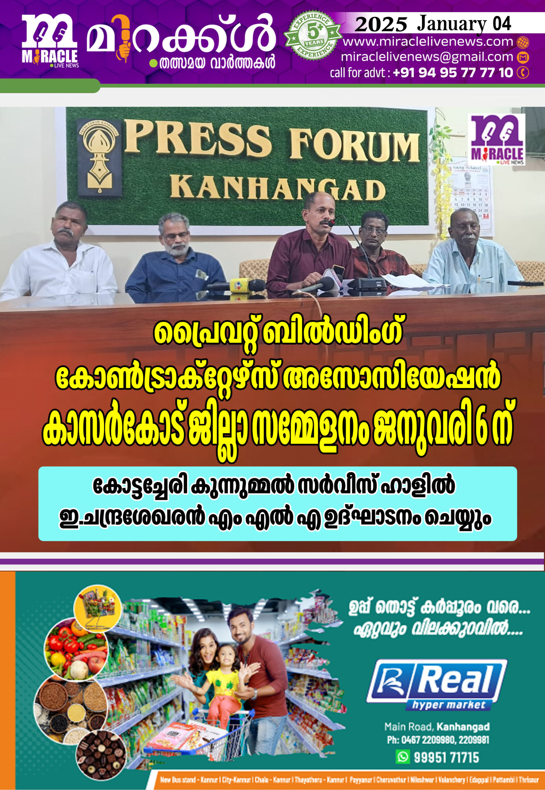 പ്രൈവറ്റ് ബില്‍ഡിംഗ് കോണ്‍ട്രാക്‌റ്റേഴ്‌സ് അസോസിയേഷന്‍ കാസര്‍കോട് ജില്ലാ സമ്മേളനം ജനുവരി 6 ന്; കോട്ടച്ചേരി കുന്നുമ്മല്‍ സര്‍വീസ് ഹാളില്‍ ഇ.ചന്ദ്രശേഖരന്‍ എം എല്‍ എ ഉദ്ഘാടനം ചെയ്യും