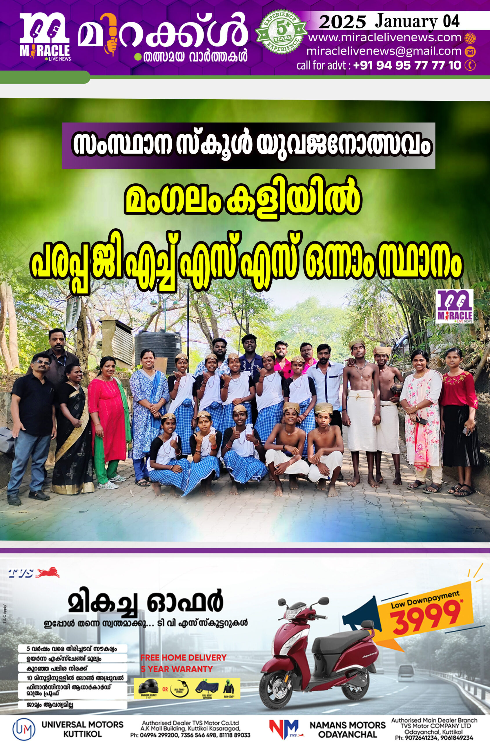 സംസ്ഥാന സ്കൂള് യുവജനോത്സവം : മംഗലം കളിയില് പരപ്പ ജി എച്ച് എസ് എസ് ഒന്നാം സ്ഥാനം