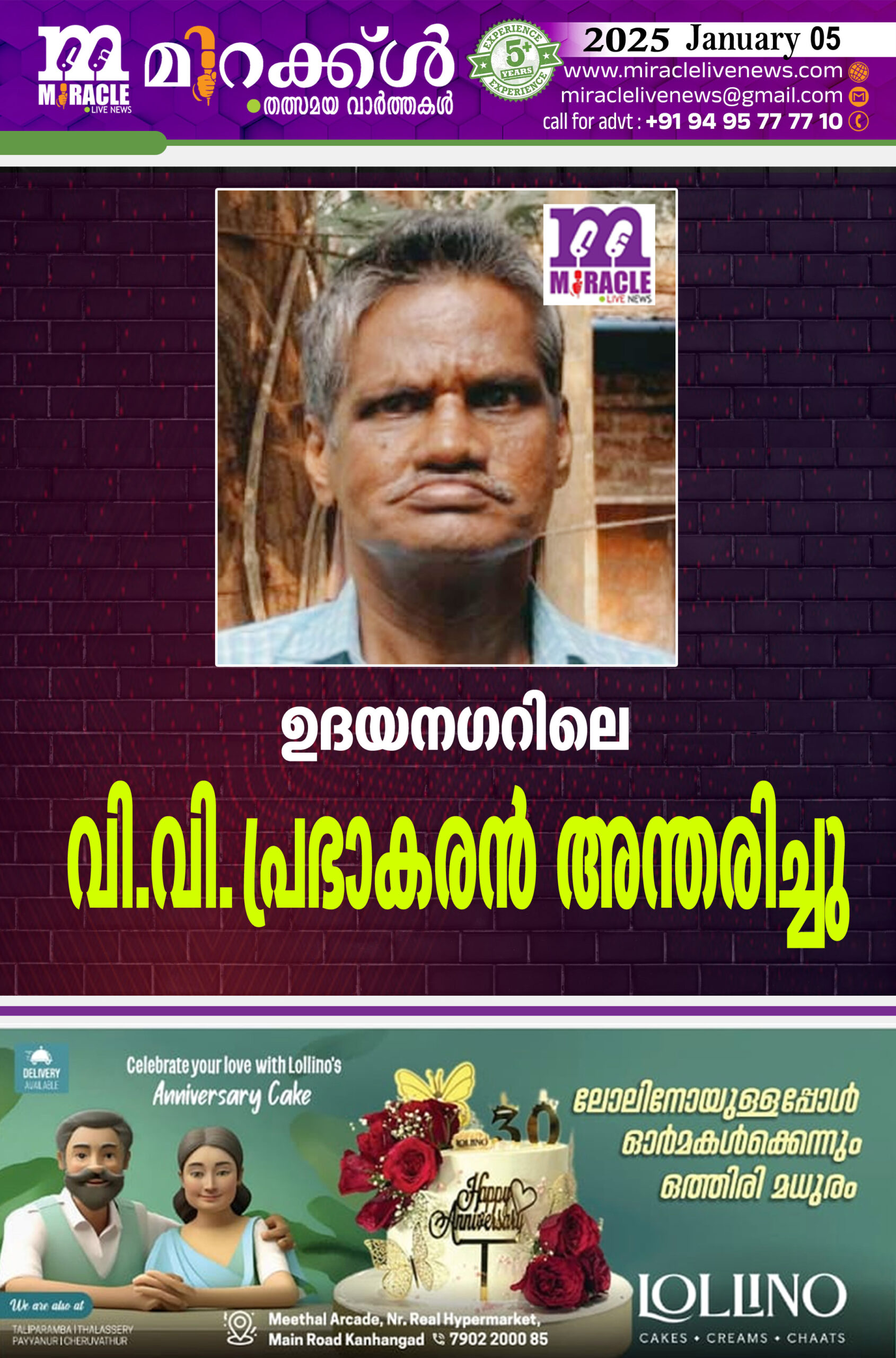 പുല്ലൂര്:ഉദയനഗറിലെ വി.വി. പ്രഭാകരന് (60) അന്തരിച്ചു. ചെറുകുന്ന് സ്വദേശിയാണ്. ഭാര്യ: വനജ