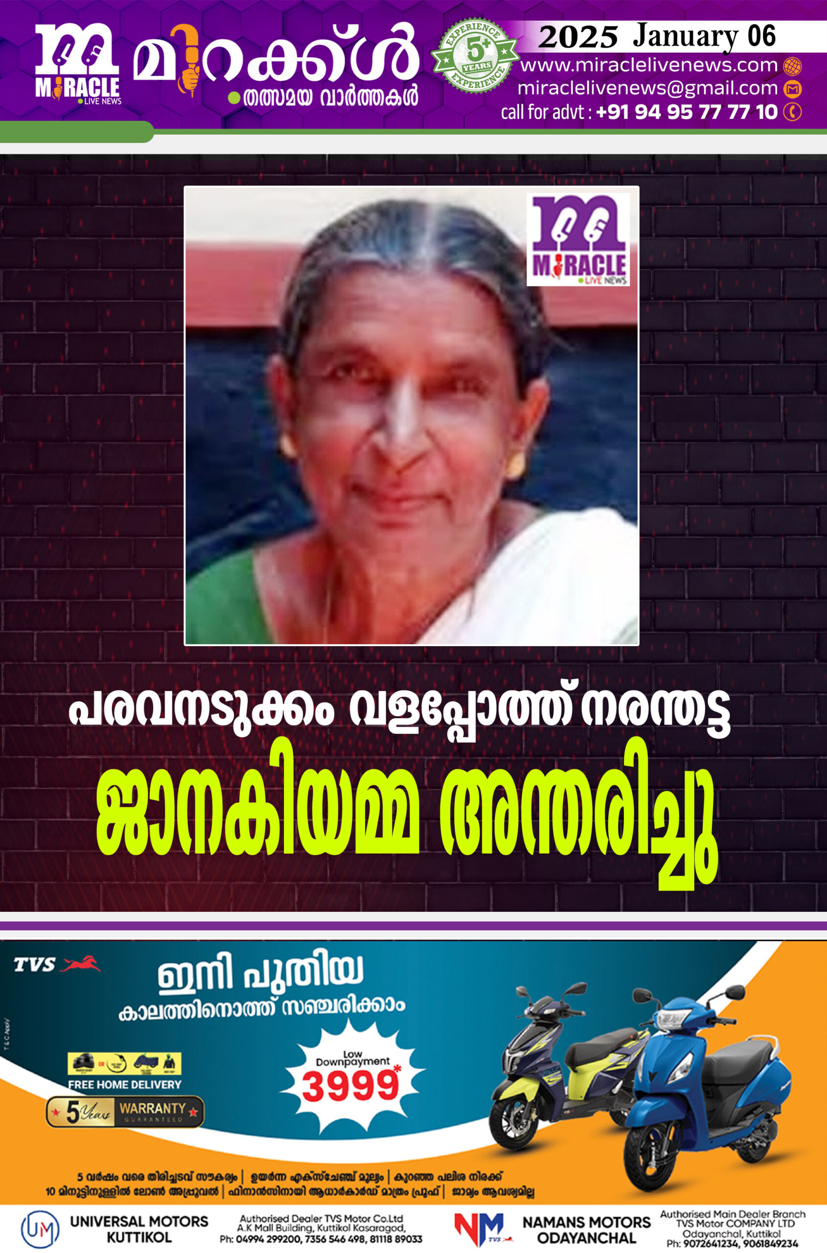പരവനടുക്കം : വളപ്പോത്ത് നരന്തട്ട ജാനകിയമ്മ (75) അന്തരിച്ചു.റിട്ടയേഡ് അംഗണ്‍വാടി വര്‍ക്കറായിരുന്നു. ഭര്‍ത്താവ് പരേതനായ കളിങ്ങോത്ത് കേളുനായര്‍.മക്കള്‍: എന്‍ രാജേന്ദ്രന്‍ നമ്പ്യാര്‍, (ഗള്‍ഫ് ) , എന്‍ ബാബുരാജ് ബിജെപി കാസര്‍കോട് ജില്ല സെല്‍ കോര്‍ഡിനേറ്റര്‍), പ്രിത .മരുമക്കള്‍ ശാലിനി (കോളിയടുക്കം), ശോഭ (സംയുജിത ശിശു വികസന പദ്ധതി സൂപ്പര്‍വൈസര്‍),ശശി ബല്ലത്ത് (കെട്ടിട നിര്‍മ്മാണ തൊഴിലാളി).സഹോദരങ്ങള്‍ പരേതരായ രാമന്‍ നായര്‍ (റിട്ട. പോലീസ് ) , ഇച്ചിരമ്മ, കേളു നായര്‍, കൃഷ്ണന്‍,കോമന്‍ നായര്‍,കല്യാണിയമ്മ.