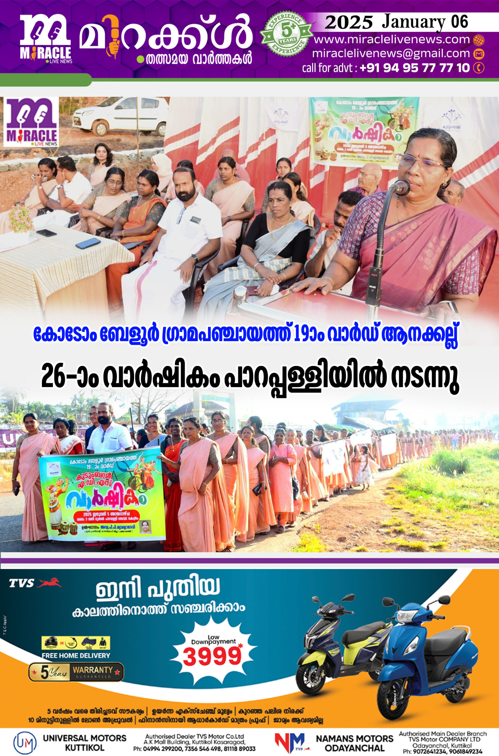 അമ്പലത്തറ :കോടോം ബേളൂര് ഗ്രാമപഞ്ചായത്ത് 19ാം വാര്ഡ് ആനക്കല്ലിന്റെ 26-ാം വാര്ഷികം പാറപ്പള്ളിയില് നടന്നു. ആനക്കല്ല് എ ഡി എസ് കഴിഞ്ഞ മൂന്ന് വര്ഷം നടത്തിയ പ്രവര്ത്തനങ്ങള് വിലയിരുത്തി. വാര്ഷികാ ആഘോഷത്തിന്റെ ഭാഗമായി സാംസ്കാരിക ഘോഷയാത്ര സംഘടിപ്പിച്ചു. ഘോഷയാത്ര അമ്പലത്തറയില് നിന്ന് ആരംഭിച്ചു. വിവിധ കലാരൂപങ്ങള് വാദ്യഘോഷങ്ങള് ശിങ്കാരിമേളം എന്നിവയുടെ അകമ്പടിയോടു കൂടി വാര്ഡിലെ മുഴുവന് കുടുംബശ്രീ അംഗങ്ങളും ബാലസഭ കുട്ടികള് നാട്ടുകാരും പങ്കെടുത്തു. സാംസ്കാരിക പൊതുയോഗം മുന് ജില്ലാപഞ്ചായത്ത് പ്രസിഡന്് അഡ്വ . പി. പി. ശ്യാമളാദേവി ഉദ്ഘാടനം ചെയ്തു. പഞ്ചായത്ത് വൈസ് പ്രസിഡന്റ് പി.ദാമോദരന് ആദ്യക്ഷത വഹിച്ചു. കുടുംബശ്രീ ജില്ലാ മിഷന് കാസര്കോട് എഡിഎംസി ഡി . ഹരിദാസ് മുഖ്യാതിഥി ആയിരുന്നു. സി ഡി എസ് ചെയര് പേഴ്സണ് സി . ബിന്ദു, ബ്ലോക്ക് പഞ്ചായത്ത് വികസന കാര്യ സ്റ്റാന്റിംഗ് കമ്മറ്റി ചെയര്പേഴ്സണ് രജനി കൃഷ്ണന്, സി ഡി എസ് വൈസ് ചെയര് പേഴ്സണ് പി എല് ഉഷ കുമാരി, ഒന്നാം വാര്ഡ് മെമ്പര് പി.കുഞ്ഞികൃഷ്ണന് , വാര്ഡ് കണ്വീനര് ജയകുമാര്, സി പി എം ഏഴാം മൈല് ലോക്കല് സെക്രട്ടറി സി ബാബുരാജ് , കമ്യൂണിറ്റി കൗണ്സിലര് കെ.വി തങ്കമണി, അഗ്രീ സി ആര് പി സവിത സിപി , എം ഇ സി ശ്രീഷ്മ എന്നിവര് സംസാരിച്ചു. സെക്രട്ടറി കലാരജ്ഞിനി സ്വാഗതം പറഞ്ഞു. കുടുംബശ്രീ അംഗങ്ങളില് ഏറ്റവും പ്രായം കൂടിയ മണ്ടേങ്ങാനത്തെ മാധവിഅമ്മ, മലയാക്കോളിലെ മാധവി അമ്മ എന്നിവരെ ചടങ്ങില് പൊന്നാട അണിയിച്ച് ആദരിച്ചു. എഡി എസ് വൈസ് പ്രസിഡന്റ് ഗോപകുമാരി നന്ദിയും പറഞ്ഞു. തുടര്ന്ന് കുംടുംബശ്രീ അംഗങ്ങളുടെയും ബാലസഭാ കുട്ടികളുടെയും വിവിധ കലാപരിപാടികളുംനടന്നു.