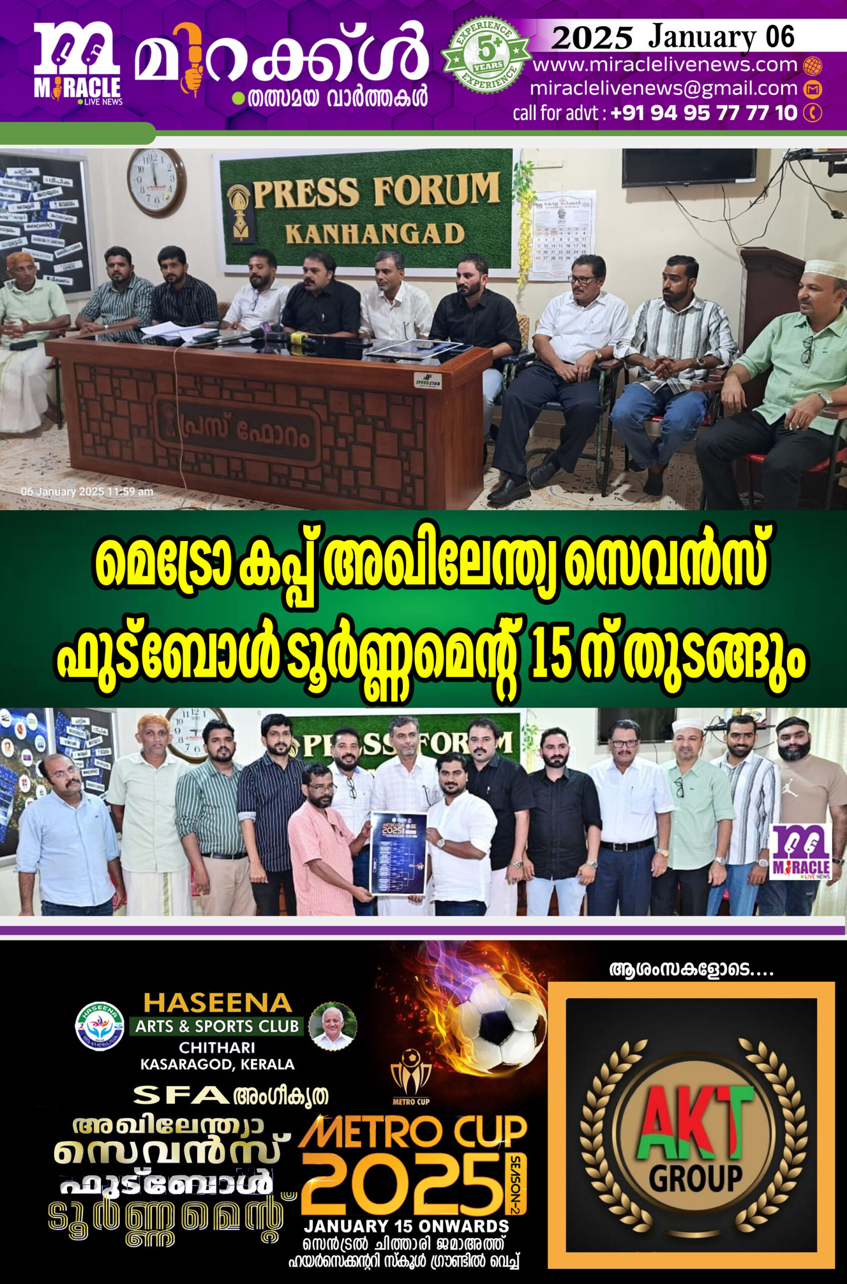 കാഞ്ഞങ്ങാട്: ചിത്താരി ഹസീന ക്ലബ്ബ് ആതി ഥേയത്വമരുളുന്ന രണ്ടാമത് കെ.എഫ്.എ അംഗീകൃത മെട്രോ മുഹമ്മദ് ഹാജി അഖി ലേന്ത്യ സെവന്സ് ഫുട്ബോള് ഫ്ളഡ് ലൈറ്റ് ടൂര്ണ്ണമെന്റ് ജനു.15ന് ചിത്താരി ജമാഅത്ത് ഹയര് സെക്കണ്ടറി സ്കൂള് ഗ്രൗണ്ടില് ആരംഭിക്കുമെന്ന് സംഘാടകര് പത്ര സ മ്മേളനത്തില് അറിയിച്ചു. രണ്ട് ലക്ഷം രൂപയുടെ പ്രൈസ് മണിക്കും ഇന്ത്യയില് തന്നെ ആദ്യമായി ഡയമണ്ട് കപ്പുമാണ് ചാംപ്യന്മാര്ക്ക് ലഭിക്കുന്ന ടൂര്ണ്ണ മെന്റാണ് മെട്രോ കപ്പ്. ഒരു ലക്ഷം രൂപ റണ്ണേഴ്സിന് നല്കും. സാമൂഹിക രാഷ്ട്രീയ രംഗങ്ങളില് നിറ സന്നിധ്യമായിരുന്ന മെട്രോ മുഹമ്മദ് ഹാജിയുടെ പേരില് ഹസീന ക്ലബ്ബ് നടത്തുന്ന രണ്ടാമ ത്തെ ടൂര്ണ്ണമെന്റാണ് ചിത്താരി ജമാഅത്ത് ഹയര് സെക്കണ്ടറി സ്കൂളില് നടക്കുന്നത്. ആദ്യ ടൂര്ണ്ണ മെന്റ് 2023-ല് പാലക്കുന്നില് വെച്ച് നടന്നിരുന്നു.ആ ടൂര്ണ്ണ മെന്റില് നിന്നും ലഭിച്ച തുകയ്ക്ക് രണ്ട് വ്യക്തികള്ക്ക് വീട് വെച്ച് നല്കിയിട്ടുണ്ട്.