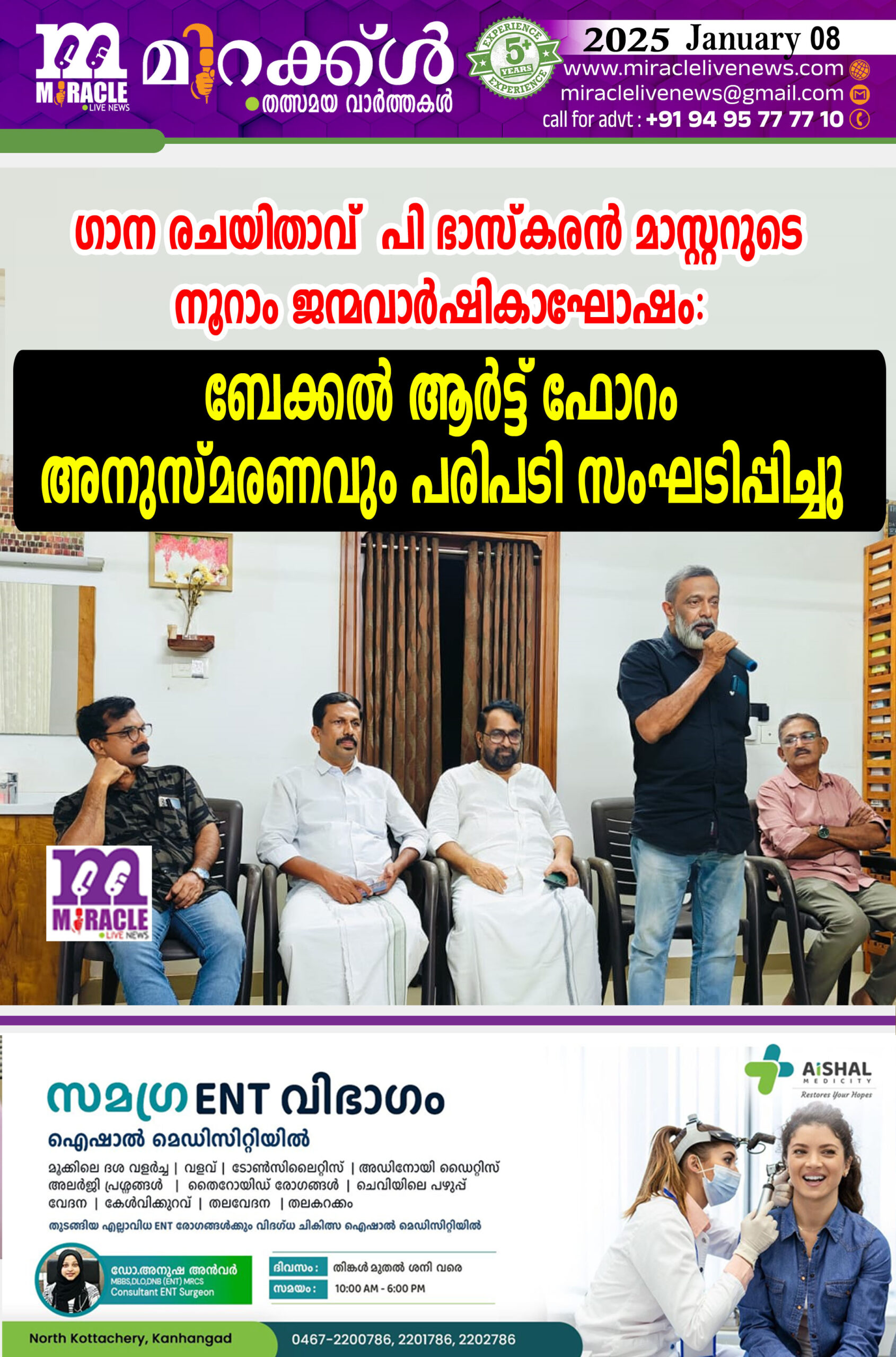 സിനി ആര്ട്ടിസ്റ് സി നാരായണന് ഉദ്ഘാടനം ചെയ്തു. രാജേഷ് കൂട്ടകനി അനുസ്മരണ പ്രഭാഷണം നടത്തി. ബേക്കല് ആര്ട്ട് ഫോറം പ്രസിഡന്റ് അബു ത്വാ ഈ ആധ്യക്ഷനായി. സെക്രട്ടറി സുകുമാരന് പൂച്ചക്കാട്, ബി എ മുഹമ്മദ്കുഞ്ഞി, കെ ദാമോദരന്,സുല്ഫിഖര് അലി,കെ എന് രാജേന്ദ്രപ്രസാദ്, സാലിം ബേക്കല്, ഡോ. മുഹമ്മദ് അലി, രാജേഷ് പള്ളിക്കര എന്നിവര് സംസാരിച്ചു പി ഭാസ്കരന് മാസ്റ്റര് രചിച്ച ഗാനങ്ങള് കോര്ത്തിണക്കി പി ഗോപാലന്, സി നാരായണന്, രാജേഷ് കൂട്ടകനി, അബു ത്വാ ഈ, നസ്സീമ വപ്പിടി, സരിത ദാമോദരന് എന്നിവര് ഗാനങ്ങള്ആലപിച്ചു