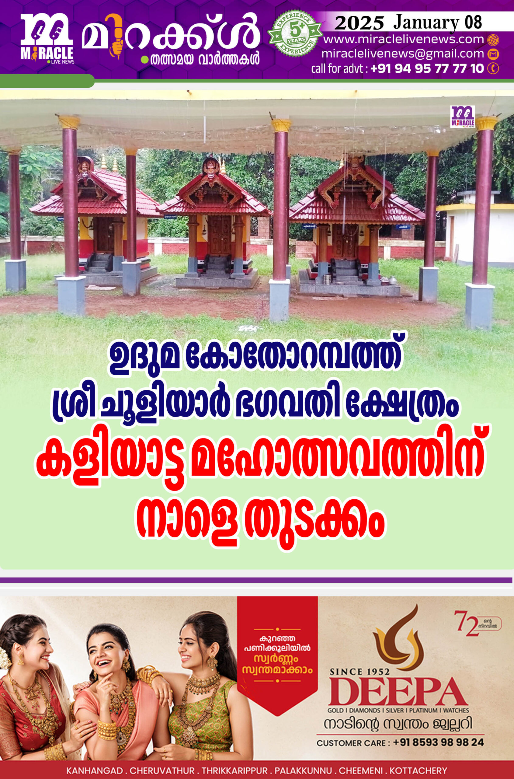 ഉദുമ : കോതോറബം തറവാട് ഉദുമകോതോറബത്ത് ശ്രീ ചൂളിയാര് ഭഗവതി ക്ഷേത്രം കളിയാട്ടമഹോത്സവം.ജനുവരി 9 മുതല് 11 വരെ തിയ്യതികളില് നടക്കും. 9ന് ഉച്ചക്ക് 12 മണിക്ക് പതിക്കാലില് അരിത്രവല്. വൈകിട്ട് 6 ശുദ്ധികളലശം, 7ന് പതിക്കാലില് നിന്നും തറവാട് വീട്ടിലേക്ക് ഭണ്ഡാരം എഴുന്നള്ളത്ത് തുടര്ന്ന്. പടിഞ്ഞാറ്റ ചാമുണ്ഡി, വിഷ്ണുമൂര്ത്തി തെയ്യങ്ങളുടെ തിടങ്ങല്. 10 ന്