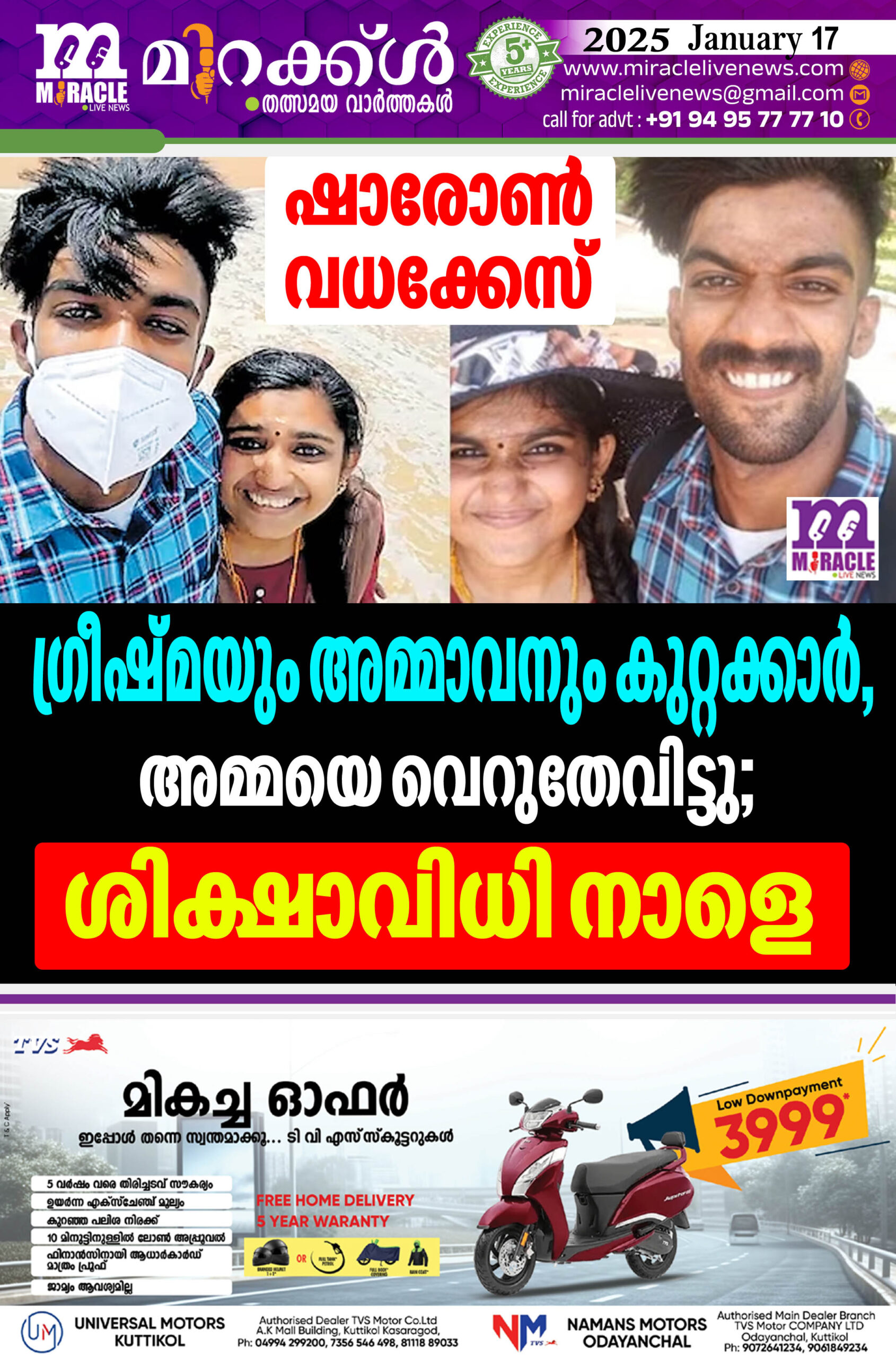 കണ്ടെത്തിയപ്പോള് കേസിലെ രണ്ടാംപ്രതി മാതാവ് സിന്ധുവിനെ വെറുതേവിട്ടു. കേസില് ശിക്ഷാവിധി നാളെ പ്രഖ്യാപിക്കും. ഗ്രീഷ്മയ്ക്കെതിരേ കൊലപാതകം അടക്കമുള്ള കുറ്റം തെളിയിക്കപ്പെട്ടു. നെയ്യാറ്റിന്കര അഡീഷണല് സെഷന്സ് കോടതിയാണ് വിധി പറയുന്നത്.