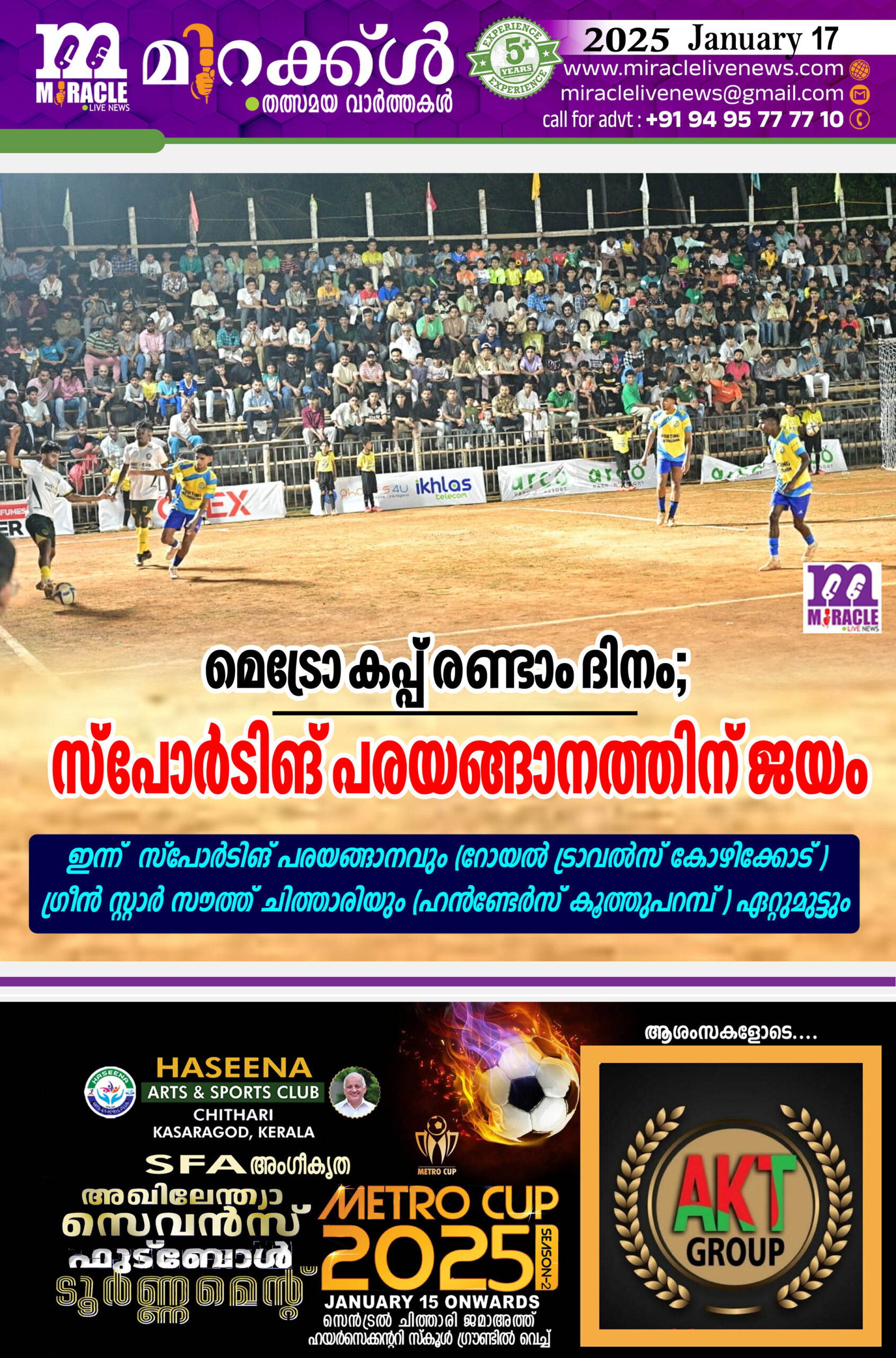 കാഞ്ഞങ്ങാട്: ചിത്താരി ഹസീന ക്ലബ്ബ് സംഘടിപ്പിക്കുന്ന രണ്ടാമത് എസ്.എഫ്.എ അംഗീകൃത മെട്രോ മുഹമ്മദ് ഹാജി അഖി ലേന്ത്യ സെവന്സ് ഫുട്ബോള് ഫ്ളഡ് ലൈറ്റ് ടൂര്ണ്ണമെന്റിന്റെ രണ്ടാം ദിവസമായ ഇന്ന് സ്പോര്ടിങ് പരയങ്ങാനം (റോയല് ട്രാവെല്സ് കോഴിക്കോട് )രണ്ടിനെതിരെ മൂന്ന് ഗോളുകള്ക്ക് ബ്രദേര്സ് തെക്കേപുറത്തെ (ടൗണ് ടീം അരീക്കോട്) പരാജയപ്പെടുത്തി. കളി തുടങ്ങി ആദ്യ പകുതി ഒമ്പതാം മിനുട്ടില് സ്പോര്ട്ടിങ് പരയങ്ങാനത്തിന്റെ കാച്ചോ മാനെ ഒന്നാം ഗോള് നേടി. തുടര്ന്ന് സാലിഹിന്റെ ബൂട്ടില് നിന്നും രണ്ടാമത്തെ ഗോള് പിറന്നു .രണ്ടാം പകുതിയില് രണ്ട് മിനിട്ടിനുള്ളില് ബ്രദേര്സ് തെക്കേപുറത്തിന്റെ ആല്ഫിന് ഗോള് തിരിച്ചടിച്ചു. രണ്ടാം പകുതിയില് എട്ടാമത്തെ മിനുട്ടില് സ്പോര്ടിങ് പരയങ്ങാനത്തിന്റെ ആസിഫിന്റെ മനോഹരമായ ഷൂട്ടിലൂടെ മൂന്നത്തെ ഗോളും നേടി. രണ്ടാം പകുതിയില് ഇരുപത്തി മൂന്നാം മിനുറ്റില് ബ്രദേര്സ് തെക്കേപുറത്തിന്റെ ആല്ഫിന് രണ്ടാമത്തെ ഗോളും നേടി. മാന് ഓഫ് ദ മാച്ചായി പരയങ്ങാനത്തിന്റെ ആസിഫിനെ തിരഞ്ഞെടുത്തു. ഇന്ന് നടക്കുന്ന മത്സരത്തില് സ്പോര്ടിങ് പരയങ്ങാനവും (റോയല് ട്രാവല്സ് കോഴിക്കോട് ) ഗ്രീന് സ്റ്റാര് സൗത്ത് ചിത്താരിയും (ഹന്ണ്ടേര്സ് കൂത്തുപറമ്പ്