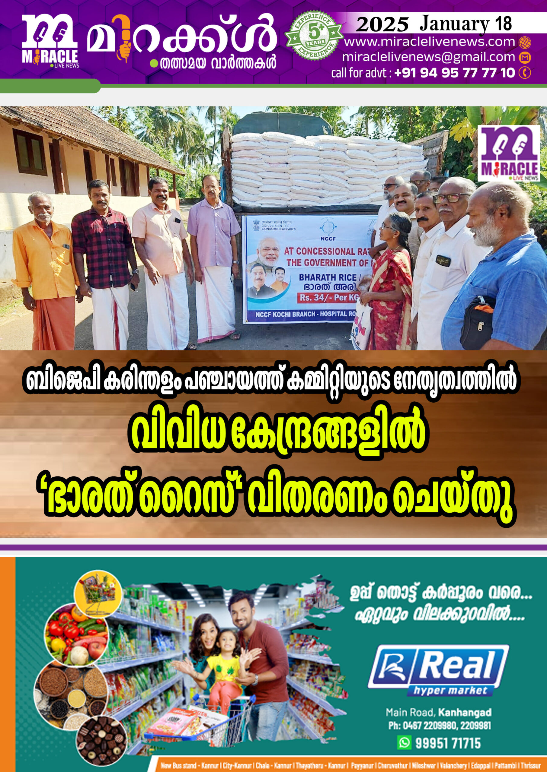ബിജെ പി കിനാനൂര് കരിന്തളം പഞ്ചായത്ത് കമ്മിറ്റിയുടെ നേതൃത്വത്തില് പഞ്ചായത്തിന്റെ വിവിധ കേന്ദ്രങ്ങളില് ‘ഭാരത് റൈസ്’- കേന്ദ്ര സര്ക്കാര് നേരിട്ട് ജനങ്ങളിലെത്തിക്കുന്ന ഭക്ഷ്യധാന്യം – വിതരണം ചെയ്തു. ഇന്നലെ രാവിലെ പരപ്പയിലെത്തിച്ച ഭാരത് റൈസ് – വിതരണം വിപി ദിവാകരന് നായര്ക്ക് അരി പായ്ക്കറ്റ് കൈമാറിക്കൊണ്ട് ചന്ദ്രന് പൈക്ക ഉദ്ഘാടനം ചെയ്തു. ബിജെപി ജില്ലാകമ്മിറ്റി അംഗം പ്രമോദ് വര്ണ്ണം, പഞ്ചായത്ത് കമ്മിറ്റി ജനറല് സെക്രട്ടറി മധു വട്ടിപ്പുന്ന, രവി പാലക്കി,ഹരികൃഷ്ണന്, കുഞ്ഞികൃഷ്ണന്, വി രാഘവന്, മധു നെല്ലിയര,ഹരിപ്രസാദ് തുടങ്ങിയവര് നേതൃത്വം നല്കി. തുടര്ന്ന് കരിന്തളത്ത് എത്തിച്ചേര്ന്ന അരി, ബി ജെ പി മണ്ഡലം വൈസ് പ്രസിഡന്റ് വിസി പത്മനാഭന്, പഞ്ചായത്ത് കമ്മിറ്റി പ്രസിഡന്റ് എസ് കെ ചന്ദ്രന് എന്നിവര് ചേര്ന്ന് വിതരണം ഉദ്ഘാടനം ചെയ്തു. എ വി ദാമോദരന്, വി ബാലകൃഷ്ണന്, ബി ദാമോദരന്, ദേവേന്ദ്രന് തമ്പി, സുധീഷ് മുതുകുറ്റി, ഇന്ദുലേഖ കരിന്തളം, കൃഷ്ണന് പൊയില്, കുഞ്ഞമ്പു മാഷ്,. അരുണ് കുമാര്, അരുണ് കോയിത്തട്ട, വിനോദ് തലയടുക്കം, രാമചന്ദ്രന് പാറക്കോല് തുടങ്ങിയവര് നേതൃത്വം നല്കി. തുടര്ന്ന് ചോയ്യങ്കോടും ഭാരത് റൈസ് വിതരണം നടത്തി. എസ് കെ ചന്ദ്രന് ഉദ്ഘാടനം ചെയ്തു. ബാലകൃഷ്ണന്, രാമചന്ദ്രന്, മനോജ് കക്കോല് എന്നിവര്നേതൃത്വംനല്കി.