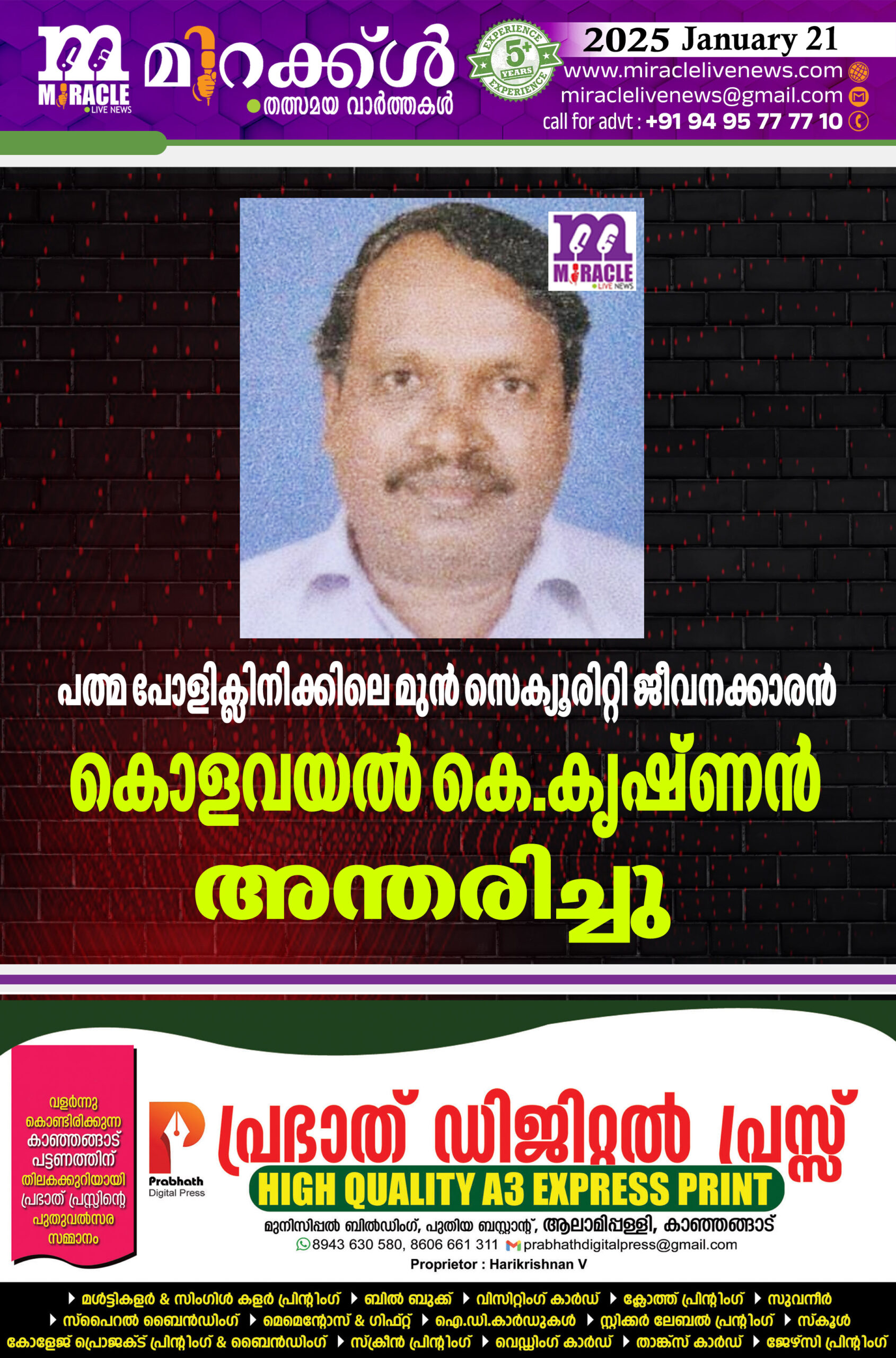 പത്മ പോളി ക്ലിനിക്കിലെ മുന് സെക്യൂരിറ്റി ജീവനക്കാരന് കൊളവയല് കെ.കൃഷ്ണന് അന്തരിച്ചു