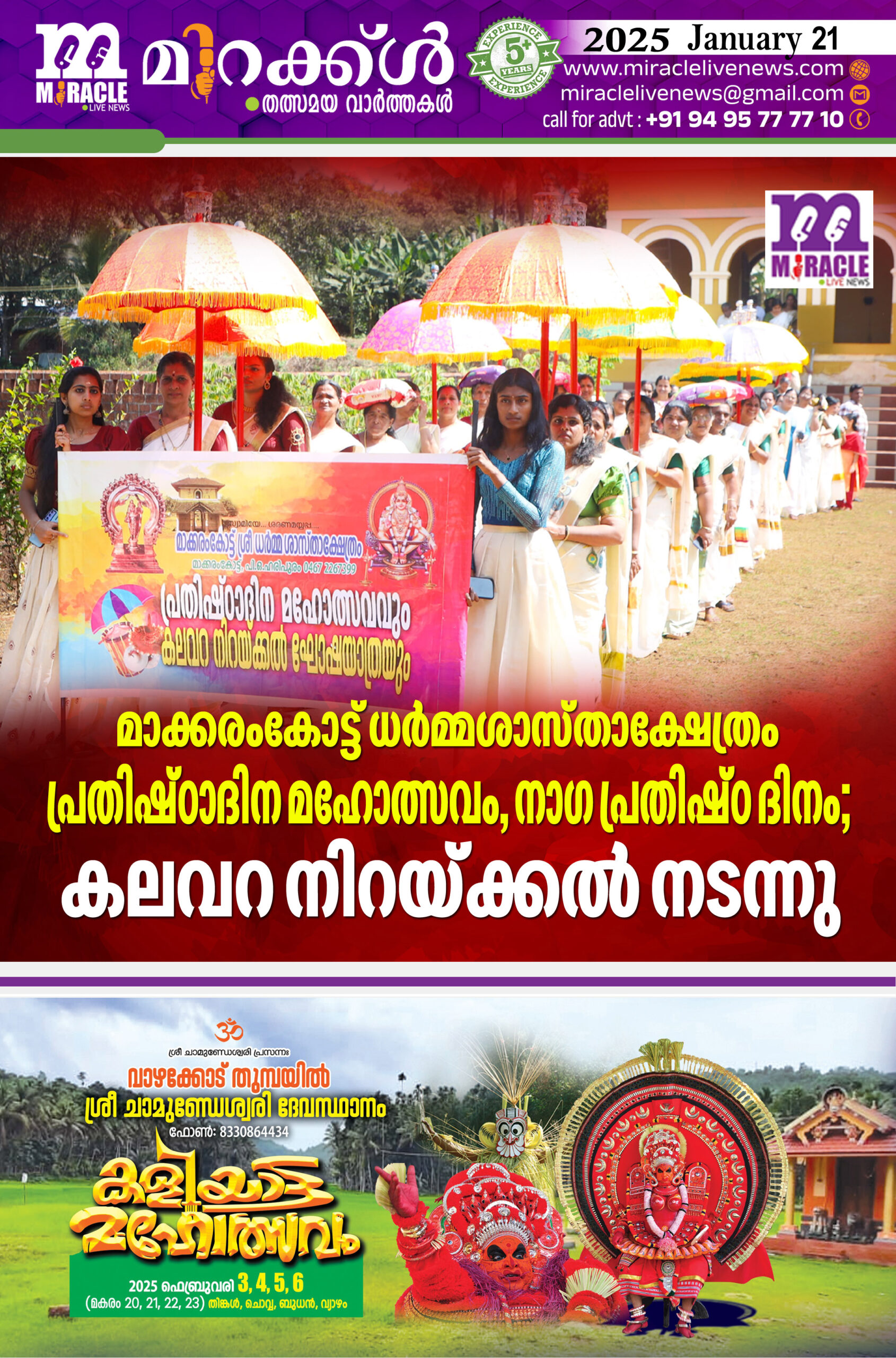 കാഞ്ഞങ്ങാട്: മാക്കരം കോട്ട് ധര്മ്മശാസ്താ ക്ഷേത്രത്തിലെ പ്രതിഷ്ഠാദിന മഹോത്സവവും നാഗ പ്രതിഷ്ഠാദിനവും ഇരിവല് മാധവന് വാഴുന്നവരുടെ മുഖ്യ കാര്മികത്വത്തില് വിവിധ പൂജാദി കര്മ്മങ്ങളോടും കലാപരിപാടികളോടും കൂടി ജനുവരി 21, 22 തീയതികളില് നടത്തപ്പെടുകയാണ്. ഉത്സവ ആഘോഷ പരിപാടികളുടെ ഭാഗമായി കലവറ നിറയ്ക്കല് ഘോഷയാത്ര നടന്നു. വാരിക്കാട്ടില്ലം അരയാല് തറക്കാല് വിഷ്ണുമൂര്ത്തി ദേവസ്ഥാനത്തു നിന്നും പുറപ്പെട്ട ഘോഷയാത്രയില് ചെണ്ടമേളം, മുത്തുക്കുട എന്നിവയുടെ അകമ്പടിയോടു കൂടി നിരവധി പേര് പങ്കെടുത്തു. തുടര്ന്ന് അന്നദാനവും വിവിധ പൂജാദികളും നടന്നു. രാത്രി നൃത്ത സന്ധ്യയും അത്താഴ പൂജയും നടന്നു. ജനുവരി 22ന് രാവിലെ 5 മണിക്ക് പള്ളി ഉണര്ത്തലും തുടര്ന്ന് അഭിഷേകം, ഗണപതിഹോമം, ഉഷപൂജ, വിവിധ പൂജാദികള് എന്നിവയും നടക്കും. സര്വ്വ ഐശ്വര്യ വിളക്ക് പൂജ, ഭജനാമൃതം, സര്പ്പ ദുരിത കര്മ്മങ്ങള്, ഉച്ചപൂജ,അന്നദാനം, തായമ്പക, അത്താഴപൂജ, ശ്രീഭൂതബലി, തിടമ്പ് നൃത്തം എന്നിവയും നടക്കും. പരിപാടികള്ക്ക് മേല്ശാന്തി ശ്രീധരന് നമ്പൂതിരി, ക്ഷേത്ര സെക്രട്ടറി കെ. പ്രഭാകരന്, പ്രസിഡണ്ട് എം.ടി. ദാമോദരന്, ഖജാന്ജി കെ. വിനോദ് കുമാര് എന്നിവര് നേതൃത്വം നല്കുന്നു.
