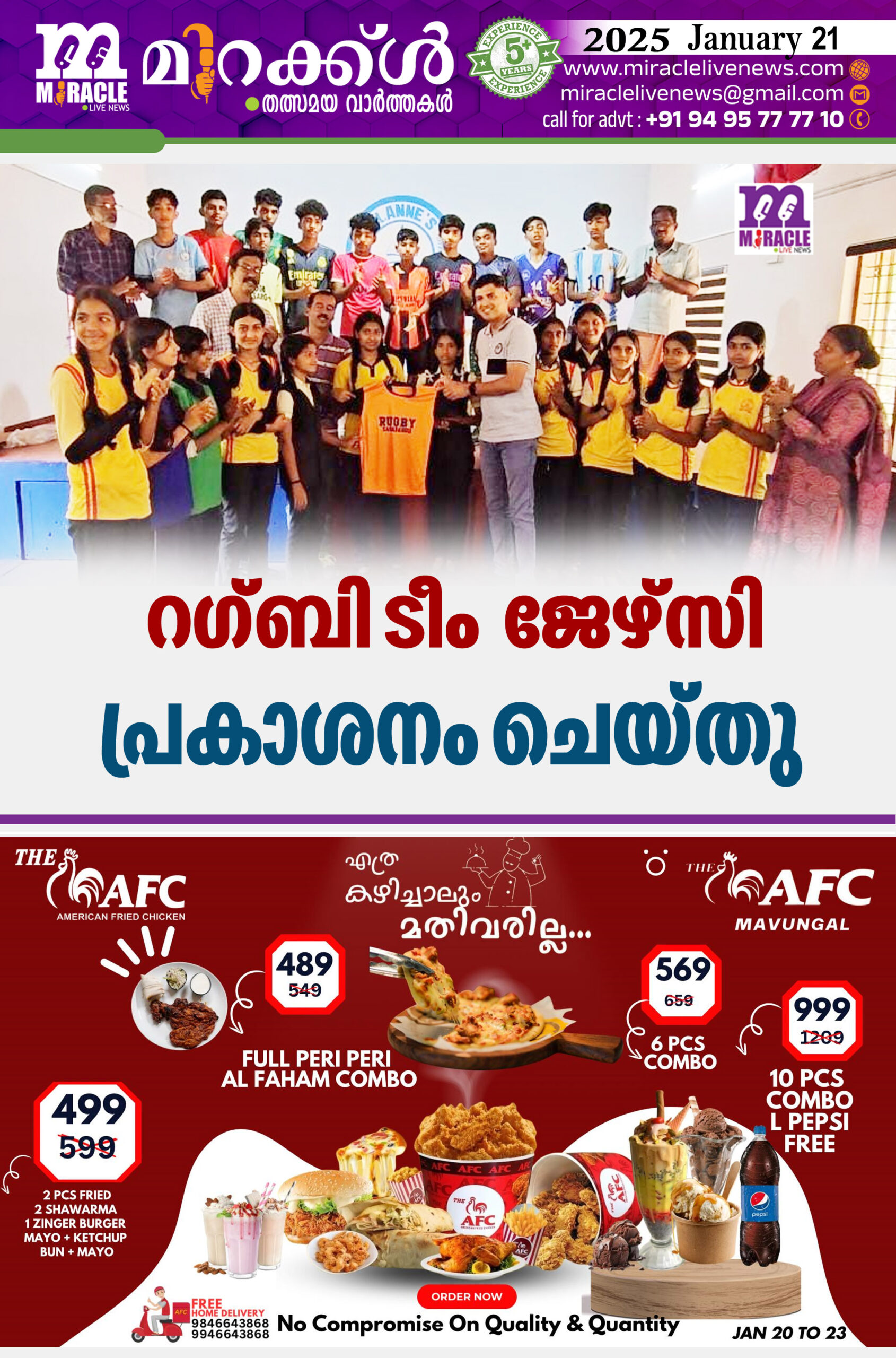 ചുള്ളിക്കര: കാസര്കോട് ജില്ലാ റഗ്ബി അസോസിയേഷന് പുതിയ സീസണിലേക്കുള്ള ജേഴ്സി പ്രകാശനം ചെയ്തു. അണ്ടര് 15 സംസ്ഥാന റഗ്ബി ചാമ്പ്യന്ഷിപ്പില് പങ്കെടുക്കുന്ന കായിക താരങ്ങള് കൊട്ടോടി സെന്റ് ആന്സ് കറന്സ്പോണ്ടന്റ് ഫാദര് സനീഷ് കയ്യാലക്കകത്തില് നിന്ന് ജില്ലാ ടീം ക്യാപ്റ്റന് മരിയ ഷാജി പുതിയ ജേഴ്സി ഏറ്റുവാങ്ങി. സ്കൂള് പ്രിന്സിപ്പാള് മധുസൂദനന് മങ്കത്തില്,അധ്യാപിക ടെസ്സി, മജീദ് ചെമ്പരിക്ക , റഗ്ബി ഭാരവാഹികളായ എം എം ഗംഗാധരന്, മനോജ് പള്ളിക്കര എന്നിവര് ചടങ്ങില് പങ്കെടുത്തു. തിരുവനന്തപുരത്ത് വെച്ച് നടക്കുന്ന സംസ്ഥാന അണ്ടര് 15 റഗ്ബി ചാമ്പ്യന്ഷിപ്പില് ജില്ലയില് നിന്നും വിവിധ വിദ്യാലയങ്ങളെ പ്രതിനിധികരിച്ച് 24 കുട്ടികള് പങ്കെടുക്കും.