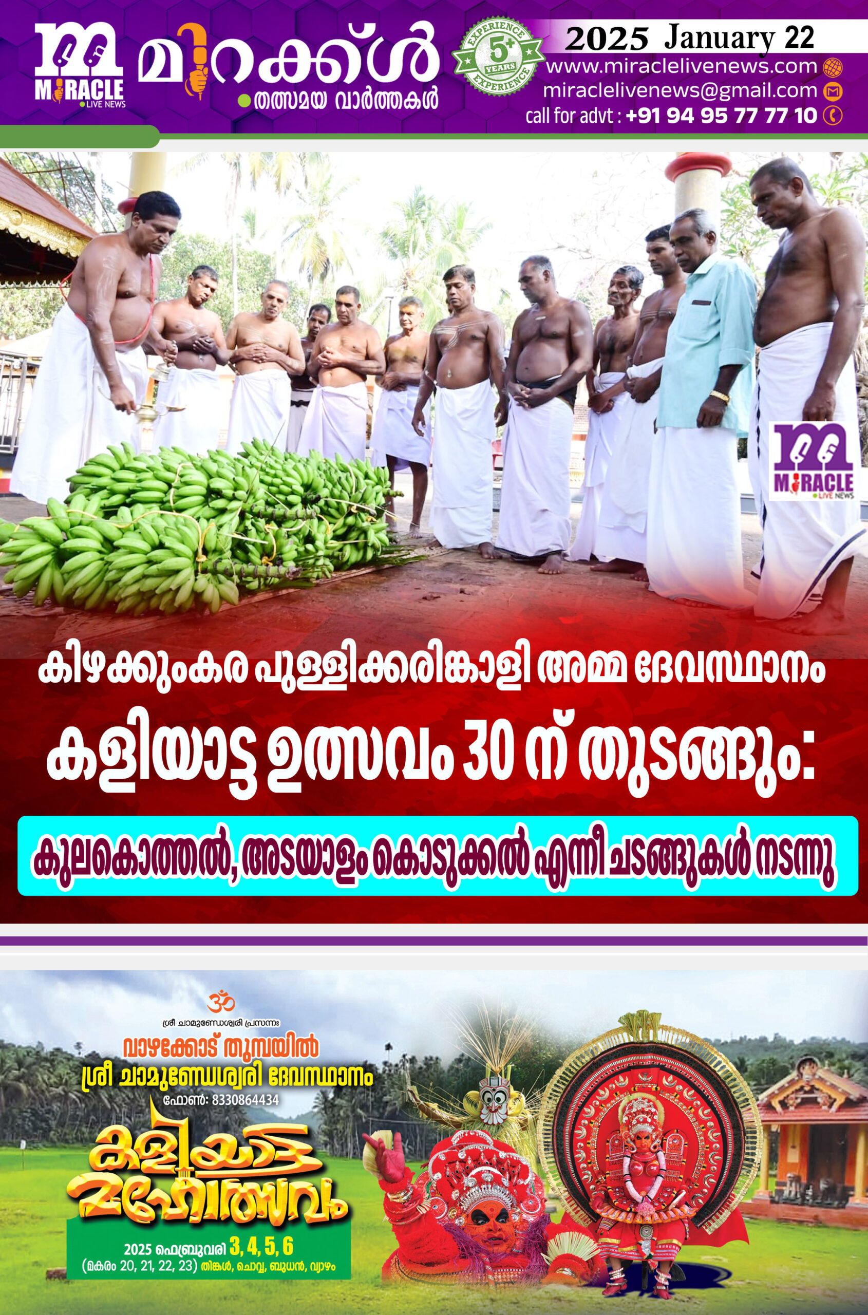 കിഴക്കുംകര പുള്ളിക്കരിങ്കാളി അമ്മ ദേവസ്ഥാനം കളിയാട്ട ഉത്സവം 30 ന് തുടങ്ങും: കുലകൊത്തല്, അടയാളം കൊടുക്കല് എന്നീ ചടങ്ങുകള് നടന്നു