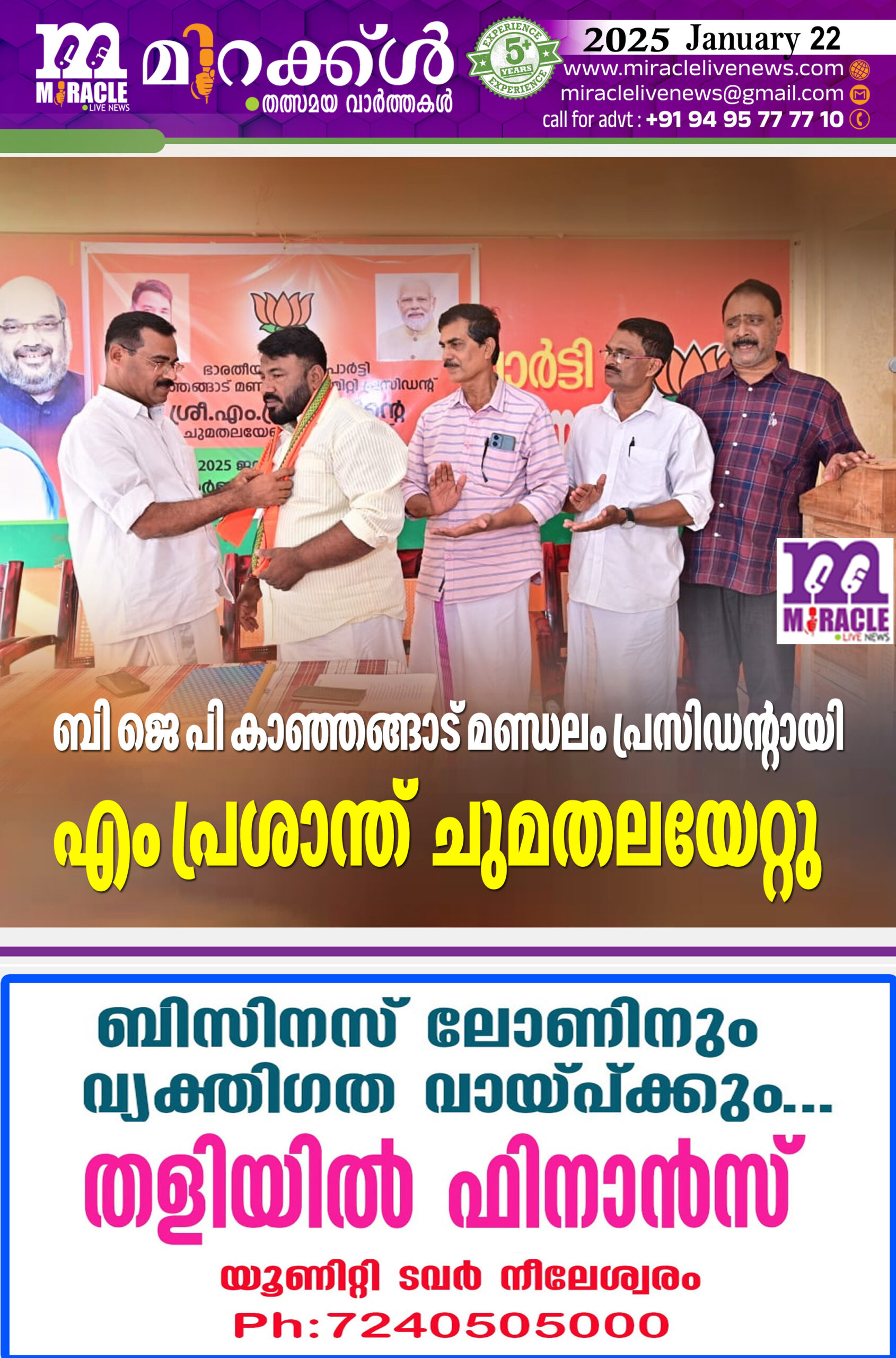 ബി ജെ പി കാഞ്ഞങ്ങാട് മണ്ഡലം പ്രസിഡന്റായി എം പ്രശാന്ത് ചുമതലയേറ്റു