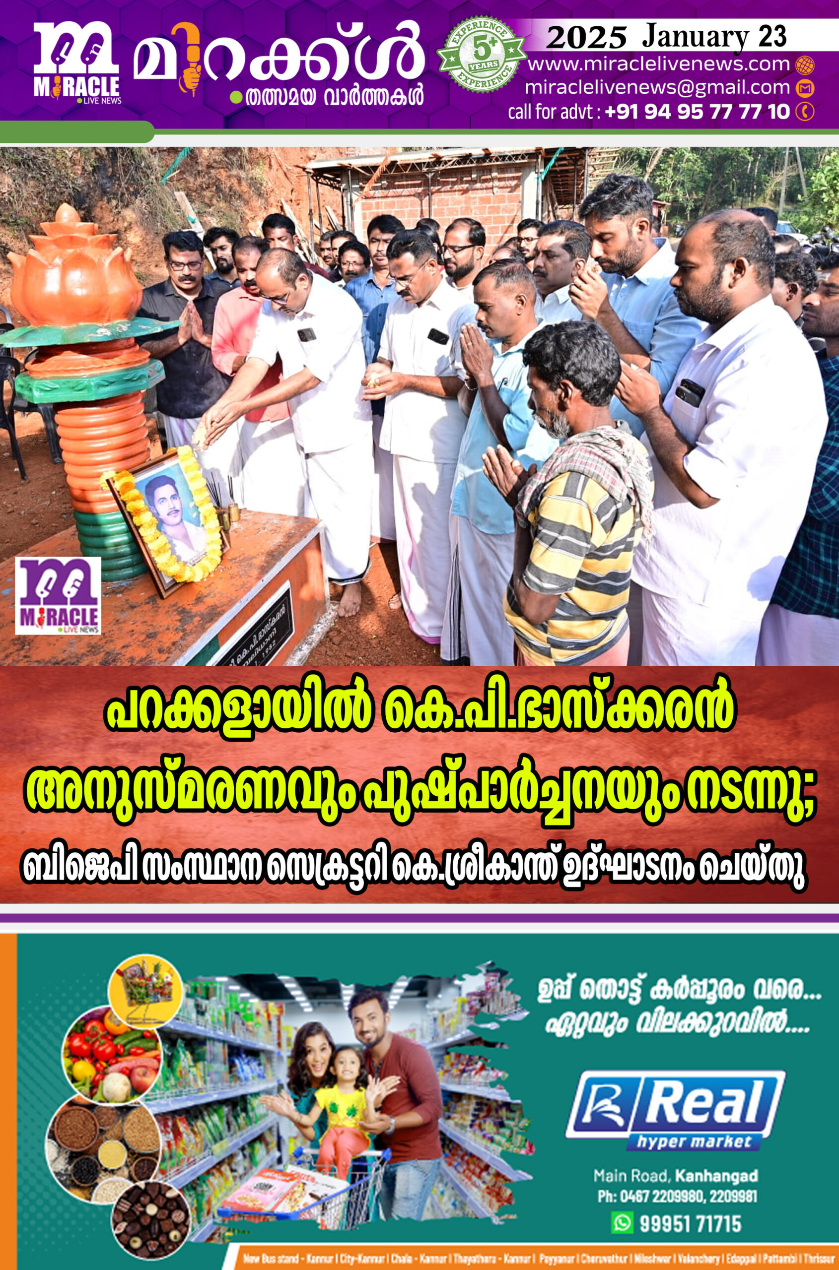 പറക്കളായി : ബി ജെ പി നേതാവായിരുന്ന കെ.പി.ഭാസ്ക്കരന്റെ 43-ാം ബലിദാന ദിനാചരണം പറക്കളായില് സ്മൃതി മണ്ഡപത്തില് നടന്നു. ബിജെപി സംസ്ഥാന സെക്രട്ടറി കെ.ശ്രീകാന്ത് ഉദ്ഘാടനം ചെയ്തു.വെള്ളരിക്കുണ്ട് മണ്ഡലം പ്രസിഡന്റ് വിനീത് മുണ്ടമാണി അദ്ധ്യക്ഷനായി.ആര് എസ് എസ് ജില്ലാ കാര്യവാഹ് ബാബു അഞ്ചാംവയല്, ബി ജെ പി ജില്ലാ ജനറല് സെക്രട്ടറി എ.വേലായുധന്, സെക്രട്ടറി മനുലാല് മേലത്ത്, കര്ഷകമോര്ച്ച ജില്ലാ പ്രസിഡന്റ് ബളാല് കുഞ്ഞിക്കണ്ണന്, ഒ ബി സി മോര്ച്ച ജില്ലാ പ്രസിഡന്റ് കെ.പ്രേംരാജ് കാലിക്കടവ്, ന്യുനപക്ഷ മോര്ച്ച ജില്ലാ പ്രസിഡന്റ് റോയി പറക്കളായി, ബി ജെ പി മണ്ഡലം ജനറല് സെക്രട്ടറി കെ.കെ.വേണുഗോപാല്, വാര്ഡ് മെമ്പര് ജ്യോതി രാധാകൃഷ്ണന് എന്നിവര് പ്രസംഗിച്ചു. ശ്രീജിത്ത് പറക്കളായി സ്വാഗതവും, വിനു പൂതങ്ങാനം നന്ദിയും പറഞ്ഞു.