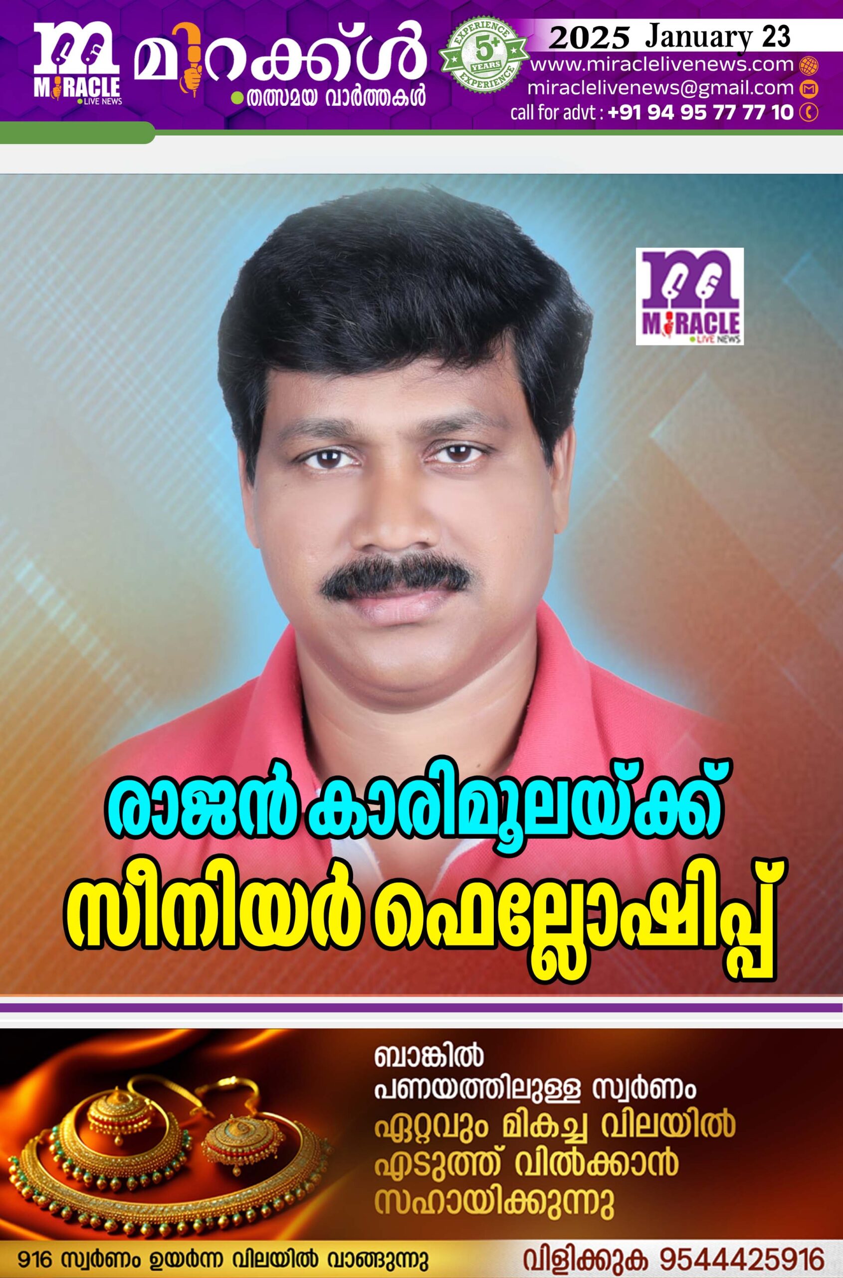 നീലേശ്വരം : ഫോട്ടോഗ്രാഫര് രാജന് കാരിമൂലയ്ക്കു കേന്ദ്ര സാംസ്കാരിക വകുപ്പിന്റെ കീഴിലുള്ള സെന്റര്ഫോര് കള്ച്ചറല് റിസോഴ് സ് ആന്ഡ് ട്രൈനിങ്ങിന്റെ സീനിയര് ഫെല്ലോഷിപ്പ്. കേരളത്തിലെ ആദിവാസി -ഗോത്ര കലാരൂപങ്ങളുടെ ഫോട്ടോ ഡോക്യൂമെന്റേഷനാണ് രണ്ടു വര്ഷത്തെ ഫെല്ലോഷിപ്പ്. കേരള കലാമണ്ഡലം ഡോക്യുമെന്ററി അവാര്ഡ്, കൊട്ടാരക്കര ശ്രീധരന് നായര് ഡോക്യുമെന്ററി അവാര്ഡ്, കേരള കലാ കേന്ദ്രം അവാര്ഡ്, ഫോട്ടോ ഗ്രാഫിയില് ദേശീയ സംസ്ഥാന പുരസ്കാരങ്ങള് എന്നിവ നേടിയിട്ടുണ്ട്. നീലേശ്വരം ചായ്യോത്തെ കാരിമൂല നാരായണന്റെയും ഭാരതിയുടെയും മകനാണ്.