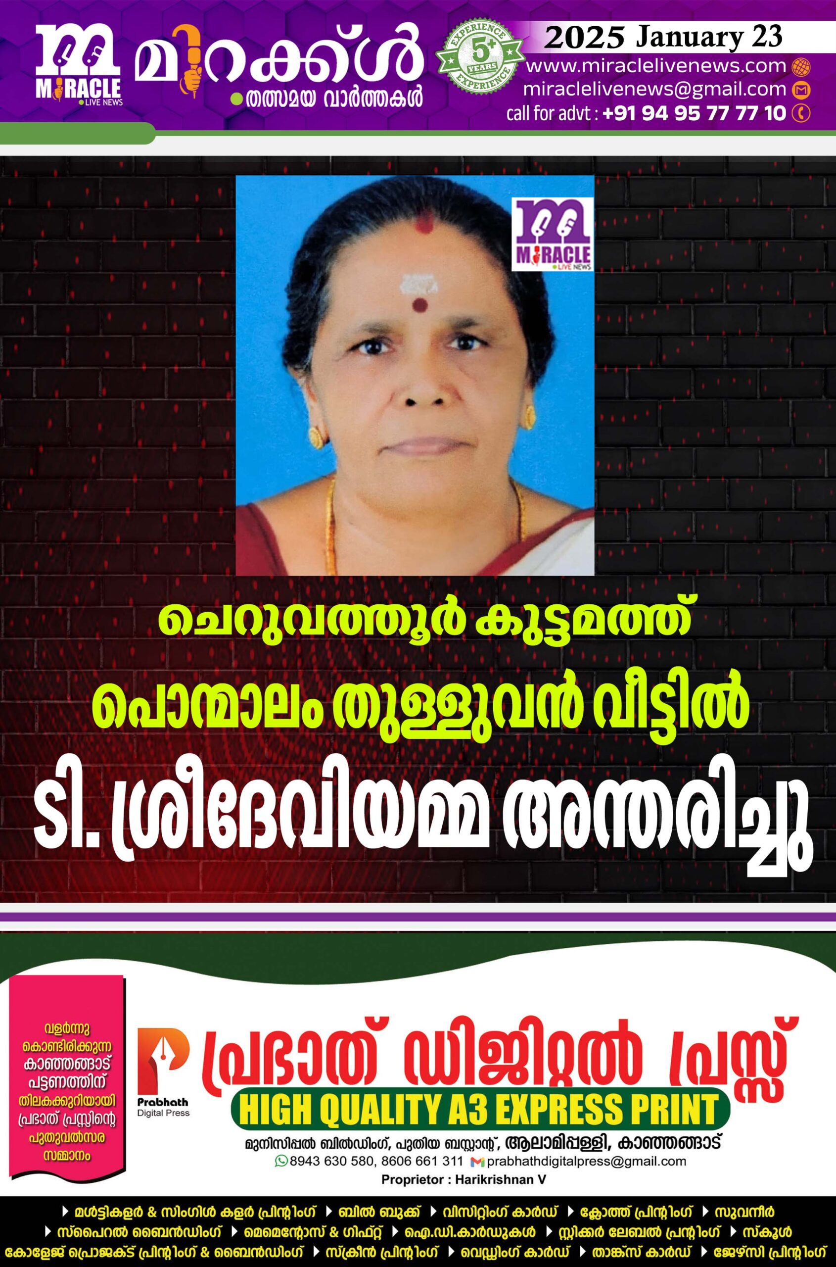 ചെറുവത്തൂര്‍ കുട്ടമത്ത് പൊന്മാലം തുള്ളുവന്‍ വീട്ടില്‍ ടി. ശ്രീദേവിയമ്മ അന്തരിച്ചു
