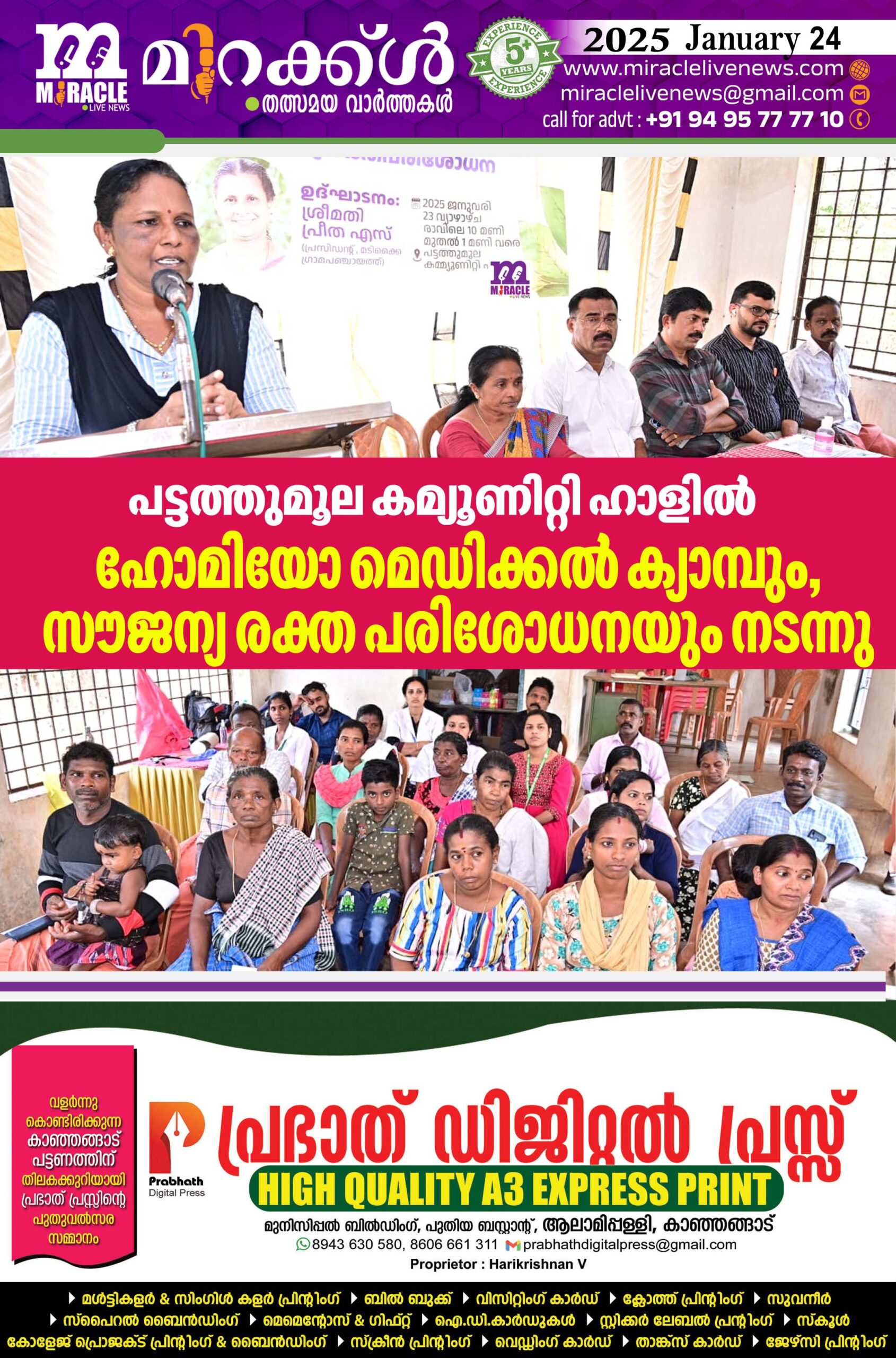 മടിക്കൈ ഗ്രാമ പഞ്ചായത്ത് സര്ക്കാര് മാതൃകാ ഹോമിയോ ഡിസ്പെന്സറി എരിക്കുളം 2024-25 വാര്ഷിക പദ്ധതി എസ് ടി മേഖല ഹോമിയോ മെഡിക്കല് ക്യാമ്പും, സൗജന്യ രക്ത പരിശോധനയും പട്ടത്തുമൂല കമ്യൂണിറ്റി ഹാളില് സംഘടിപ്പിച്ചു. മടിക്കൈ ഗ്രാമ പഞ്ചായത്ത് ആരോഗ്യ വിദ്യാഭ്യാസ സ്റ്റാന്ഡിംങ് കമ്മിറ്റി ചെയര്പേഴ്സണ് രമ പത്മനാഭന് ഉദ്ഘാടനം നിര്വ്വഹിച്ചു. വാര്ഡ് മെമ്പര് ശൈലജ എ അദ്ധ്യക്ഷത വഹിച്ചു. നാലാം വാര്ഡ് മെമ്പര് ടി രതീഷ് സംസാരിച്ചു. ഒന്നാം വാര്ഡ് മെമ്പര് എ.വേലായുധന് സ്വാഗതവും, ജി എച്ച് ഡി എരിക്കുളം മെഡിക്കല് ഓഫീസര് ഡോ. മുജീബ് റഹ്മാന് സി.എച്ച്.നന്ദിയും പറഞ്ഞു.