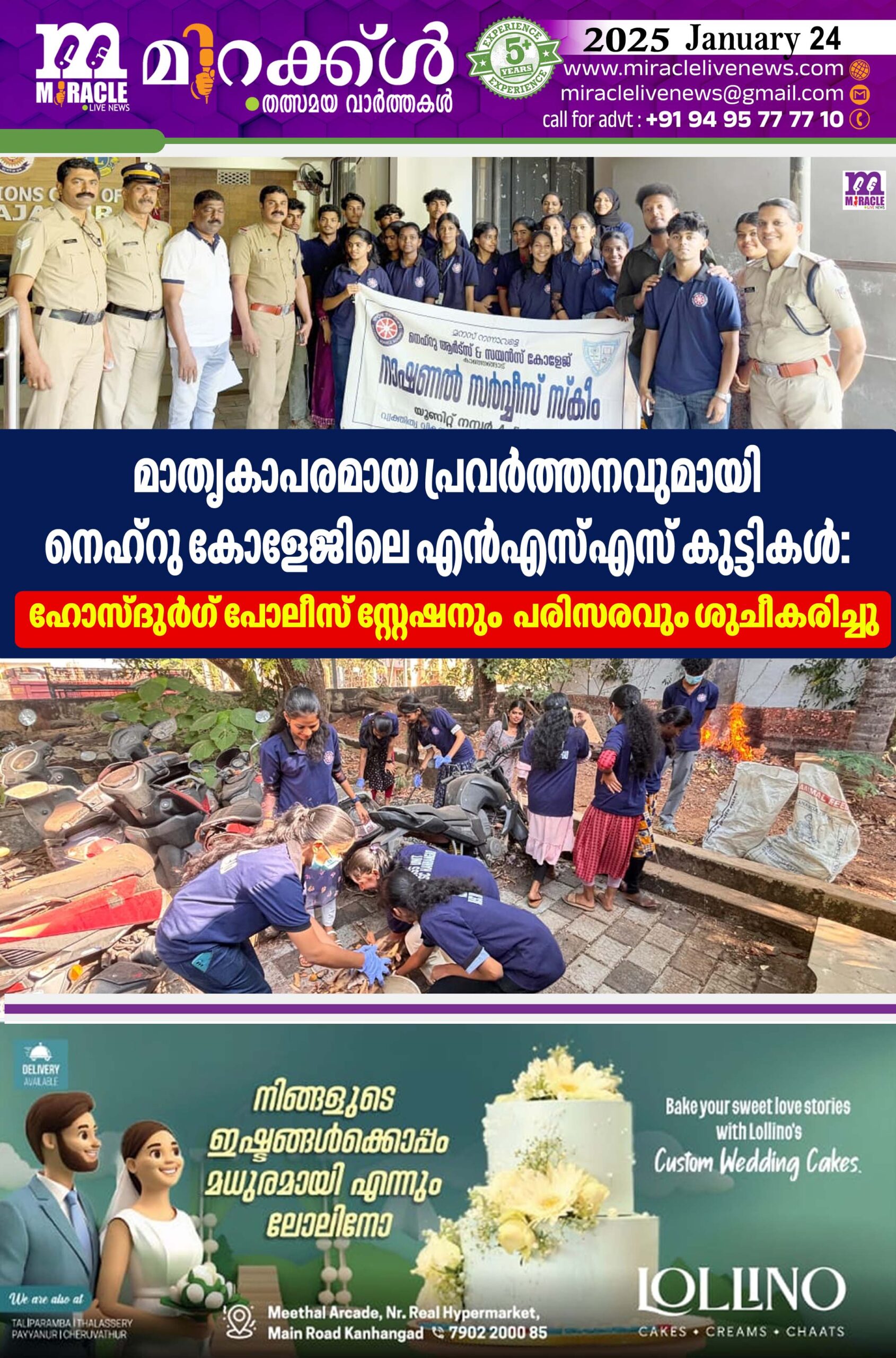മാതൃകാപരമായ പ്രവര്ത്തനവുമായി നെഹ്റു കോളേജിലെ എന്എസ്എസ് കുട്ടികള്; ഹോസ്ദുര്ഗ് പോലീസ് സ്റ്റേഷനും പരിസരവും ശുചീകരിച്ചു