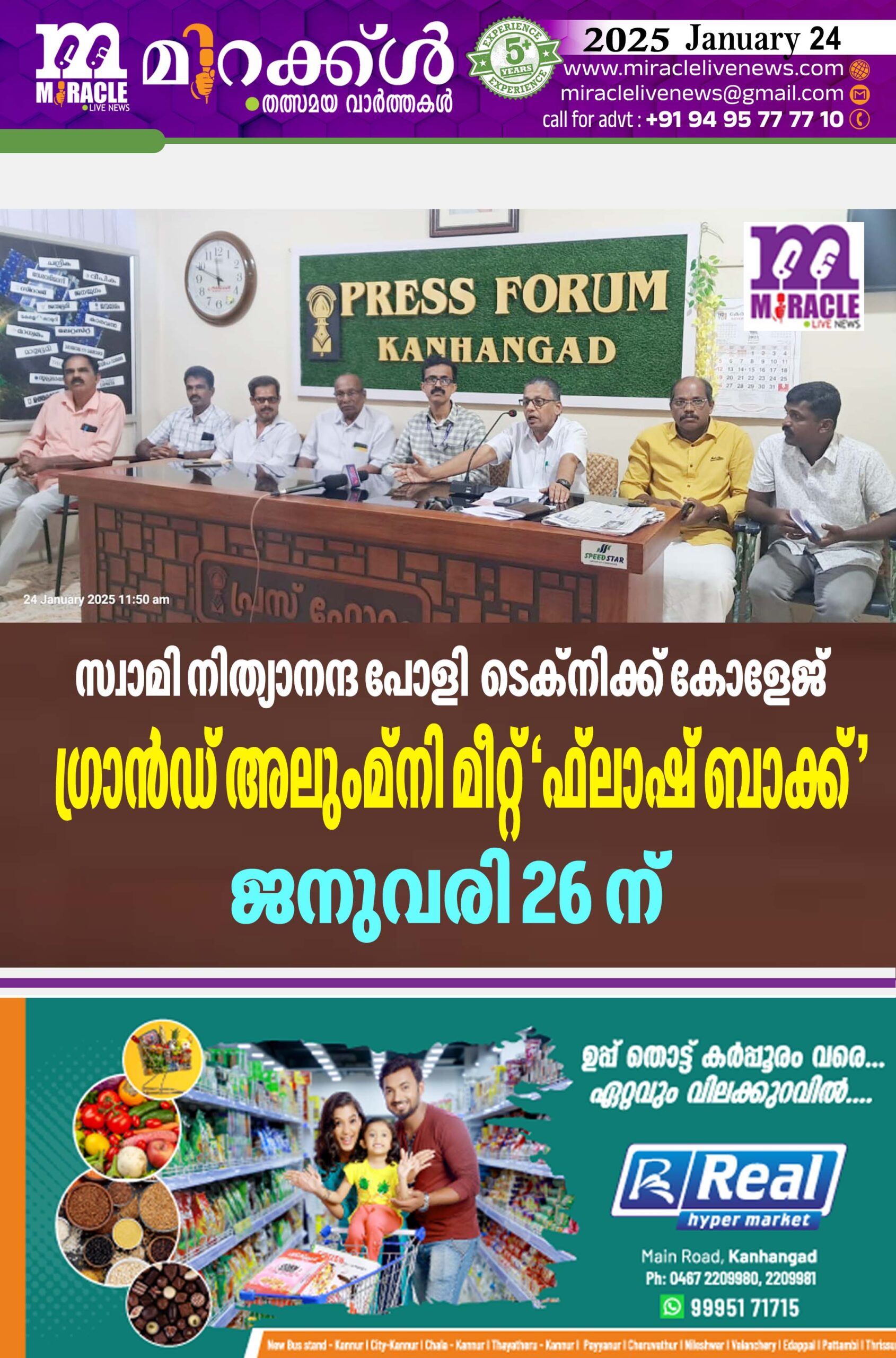 കാഞ്ഞങ്ങാട് : സ്വാമി നിത്യാനന്ദ പോളി ടെക്‌നിക്ക് കോളേജ് ഗ്രാന്‍ഡ് അലുംമ്‌നി മീറ്റ് ‘ഫ്‌ലാഷ് ബാക്ക് ‘ ജനുവരി 26ന് രാവിലെ 9 മണി മുതല്‍ പോളി ക്യാമ്പസില്‍ നടക്കുമെന്ന് സംഘാടകര്‍ വാര്‍ത്താ സമ്മേളനത്തില്‍ അറിയിച്ചു.രാവിലെ 9 മണി മുതല്‍ രജിസ്‌ട്രേഷന്‍. 10 ന് രാജ് മോഹന്‍ ഉണ്ണിത്താന്‍ എം പി പരിപാടി ഉദ്ഘാടനം ചെയ്യും.