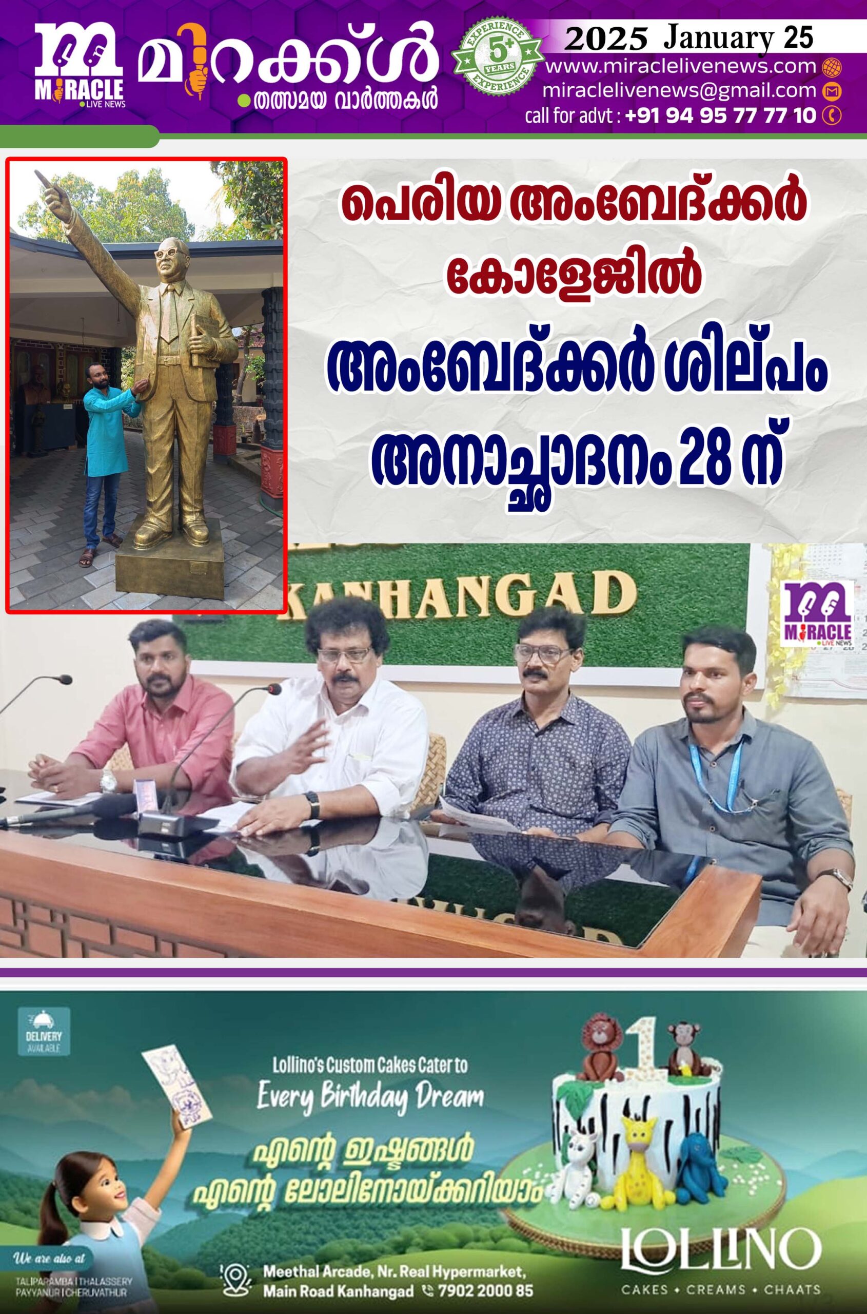 കാഞ്ഞങ്ങാട്: ഭരണഘടന ശില്പി ബി.ആര് അംബേദ്ക്കറുടെ ചിത്രന് കുഞ്ഞിമംഗലം നിര്മിച്ച ശില്പം അനാച്ഛാദനം ജനുവരി 28ന് രാവിലെ 9 ന് പെരിയ അംബേദ്ക്കര് കോളേജില് രാജ് മോഹന് ഉണ്ണിത്താന് എം.പി നിര്വഹിക്കുമെന്ന് കോളേജ് പ്രിന്സിപല് ഡോ.ജയചന്ദ്രന് കീ ഴോത്ത് പത്രസമ്മേളനത്തില് അറിയിച്ചു. ഗ്രാനൈറ്റ് പീഠത്തിലാണ് വെച്ചാണ് ശില്പം അനാച്ഛാദനം ചെയ്യുന്നത്. എന്.എസ്.എസ് യൂണിറ്റ് 67 ന്റെ നേതൃത്വത്തില് ഒരുങ്ങുന്ന ശില്പം ഇനി കോളേജിന്റെ പ്രധാന ആകര്ഷക ഘടകങ്ങളിലൊന്നാകും.