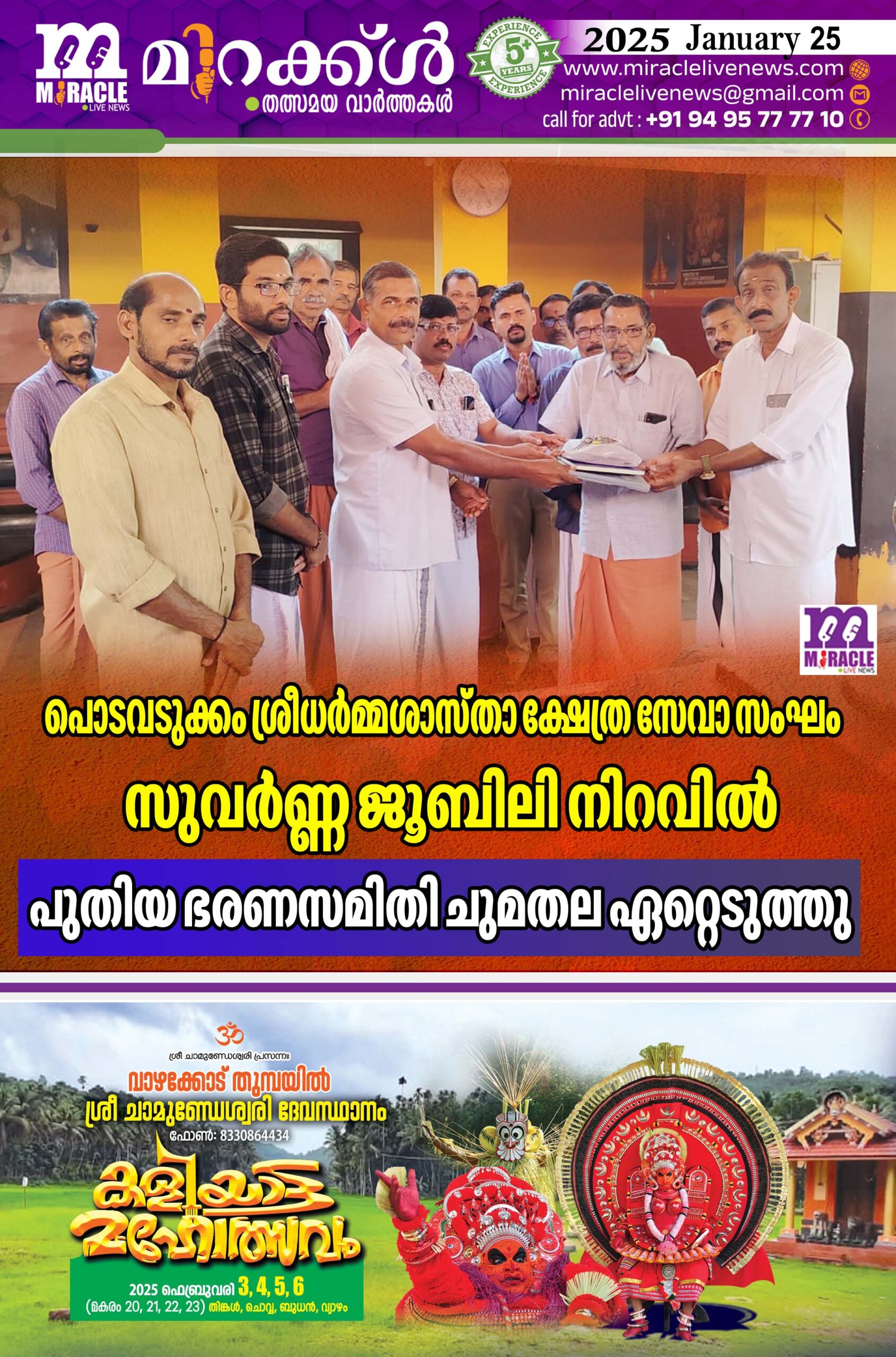 പൊടവടുക്കം ശ്രീധര്മ്മശാസ്താ ക്ഷേത്ര സേവാ സംഘം സുവര്ണ്ണ ജൂബിലി നിറവില്; പുതിയ ഭരണസമിതി ചുമതല ഏറ്റെടുത്തു