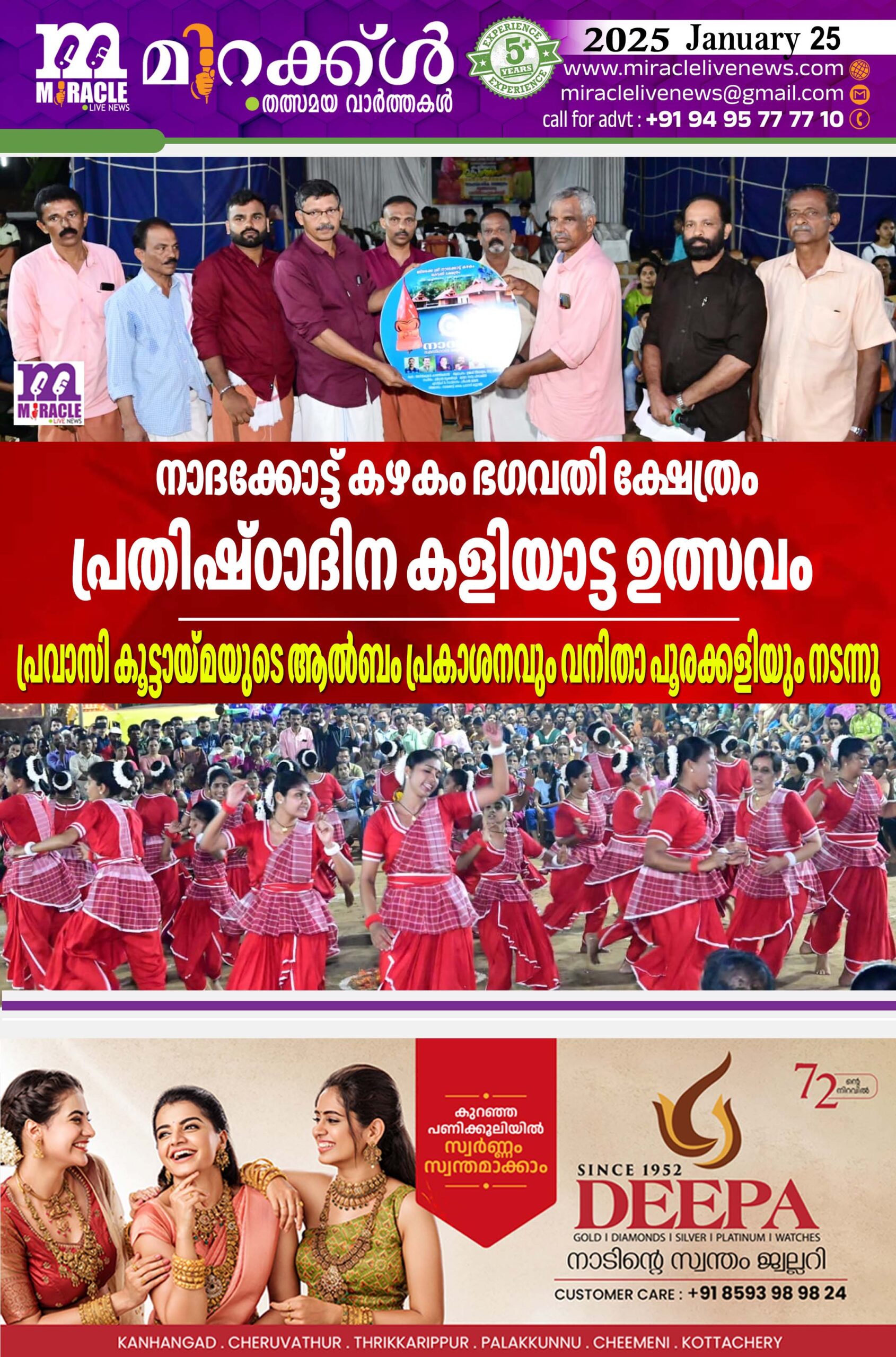 ഉത്സവത്തിന്റെ ഭാഗമായി ക്ഷേത്രം പ്രവാസി കൂട്ടായ്മ ഒരുക്കിയ നാദമായി എന്ന സംഗീത ആല്ബത്തിന്റെ പ്രകാശനം നടന്നു. ആഘോഷ കമ്മിറ്റി ജനറല് കണ്വീനര് കരിമ്പില് ഭാസ്കരന് നല്കി പൂരക്കളി കലാകാരന് മടിക്കൈ ഗോപാലകൃഷണ പണിക്കര് പ്രകാശനം ഉദ്ഘാടനം ചെയ്തു. അനില്കുമാര് കാത്തിരക്കാലിന്റെ വരികള്ക്ക് ശ്രീലാല് തൃക്കരിപ്പൂര് സംഗീതം നല്കി, നവ്യ ശ്രീലാല് ആലാപനവും പി.മനു ക്യാമറയും, സുഭാഷ് മടിക്കൈ പ്രൊഡക്ഷന് ഡിസൈനും. ശ്രീപാല് ജയന് സംവിധാനം ചെയ്ത ആല്ബത്തിന്റെ പ്രകാശനമാണ് നടന്നത്. തുടര്ന്ന് ക്ഷേത്രം മാതൃസമിതിയുടെ നേതൃത്വത്തില് കുട്ടികളും വനിതകളും അടക്കം 30 ആളുകള് അണിനിരന്ന 45 മിനിറ്റോളം ദൈര്ഘ്യമുള്ള വനിത പൂരക്കളി അരങ്ങേറി. ഉത്തര മലബാറില് അപൂര്വമായി നടക്കുന്ന വനിതാ പുരക്കളി മടിക്കൈയിലെ സജിത്ത് പണിക്കറാണ് പരിശീലനം നല്കിയത്. ക്ഷേത്രം രക്ഷാധികാരി പനക്കൂല് രാകൃഷ്ണന്, സംഘാടകസമിതി ജനറല് കണ്വീനര് കരിമ്പില് ഭാസ്കരന്, വര്ക്കിംഗ് ചെയര്മാന് അരിക്കര ചന്ദ്രന്, പ്രോഗ്രാം കമ്മിറ്റി ഭാരവാഹികളായ സേതുരാമന്, വി.വി.ഗംഗാധരന് എന്നിവര് ചേര്ന്ന് വിളക്ക് കൊളുത്തി പൂരക്കളിക്ക് തുടക്കം കുറിച്ചു. ചടങ്ങുകള്ക്ക് മുന്നോടിയായി കഴിഞ്ഞ ദിവസം ഹൃദയാഘാതത്തെ തുടര്ന്ന് അന്തരിച്ച ആഘോഷ കമ്മിറ്റി ചെയര്മാന് പനക്കൂല് തമ്പാന് ആദരാഞ്ജലികള് അര്പ്പിച്ചു. അനുശോചനത്തിന്റെ ഭാഗമായി അദ്ദേഹം രചിച്ച ഗാനത്തിന്റെ ആലാപനവും നടന്നു.