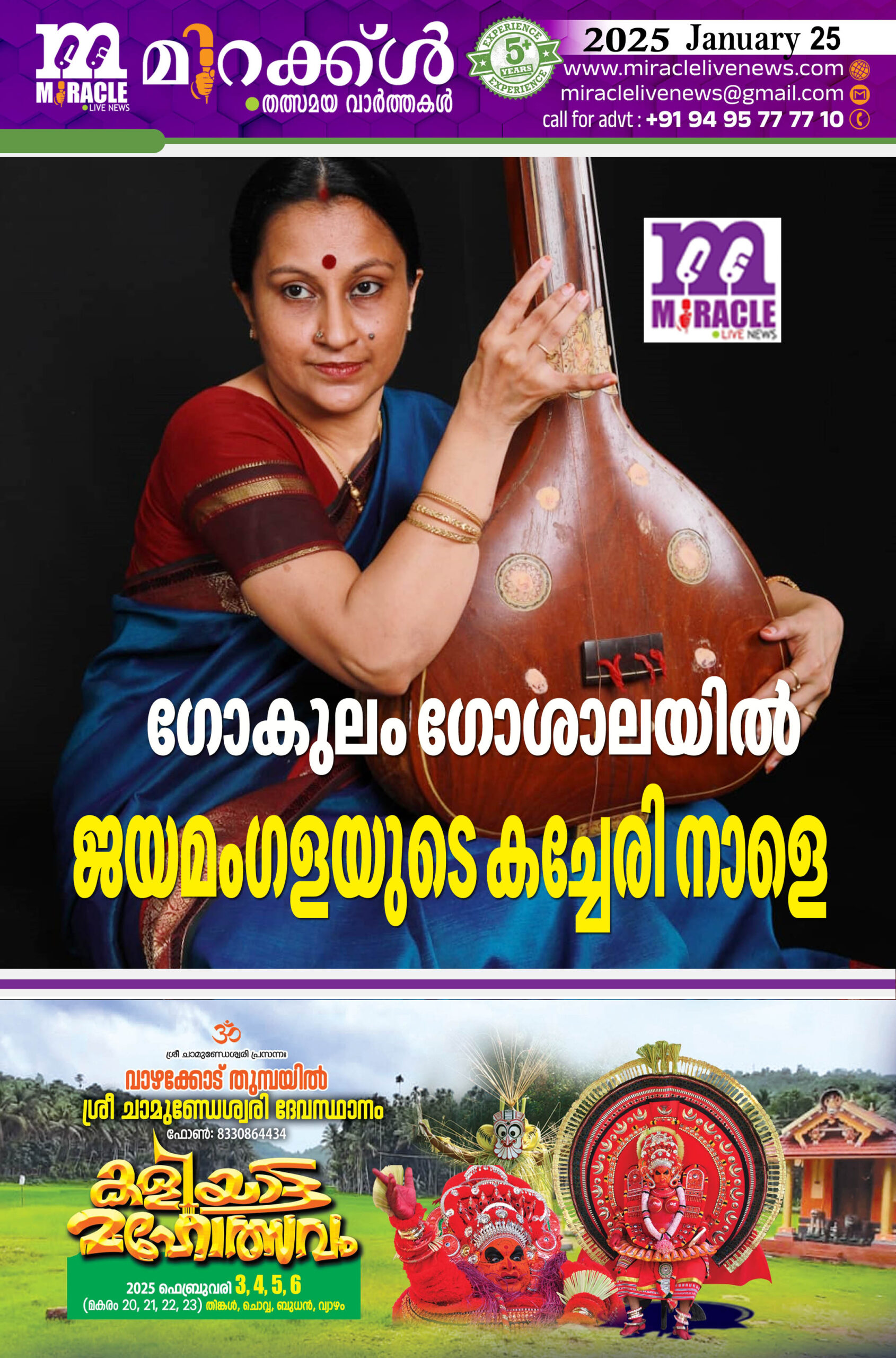 പെരിയ ഗോകുലം ഗോശാലയില് പരമ്പര വിദ്യാപീഠത്തിന് കീഴില് നടക്കുന്ന പ്രതിമാസ കച്ചേരിയില് ബാംഗ്ലൂരിലെ പ്രശസ്ത സംഗീതജ്ഞ ജയമംഗള കൃഷ്ണമണി ജനുവരി 26-ന് ഞായറാഴ്ച വൈകിട്ട് അഞ്ചിന് നാദാര്ച്ചന നടത്തും. വയലിനിലില് ബാംഗ്ലൂരിലെ കൃതിക് കൗശിക്, മൃദംഗത്തില് പലക്കാട് ജയകൃഷ്ണന്, മുഖര്ശംഖില് പയ്യന്നൂര് ഗോവിന്ദ പ്രസാദ് എന്നിവര് പക്കമേളമൊരുക്കും.