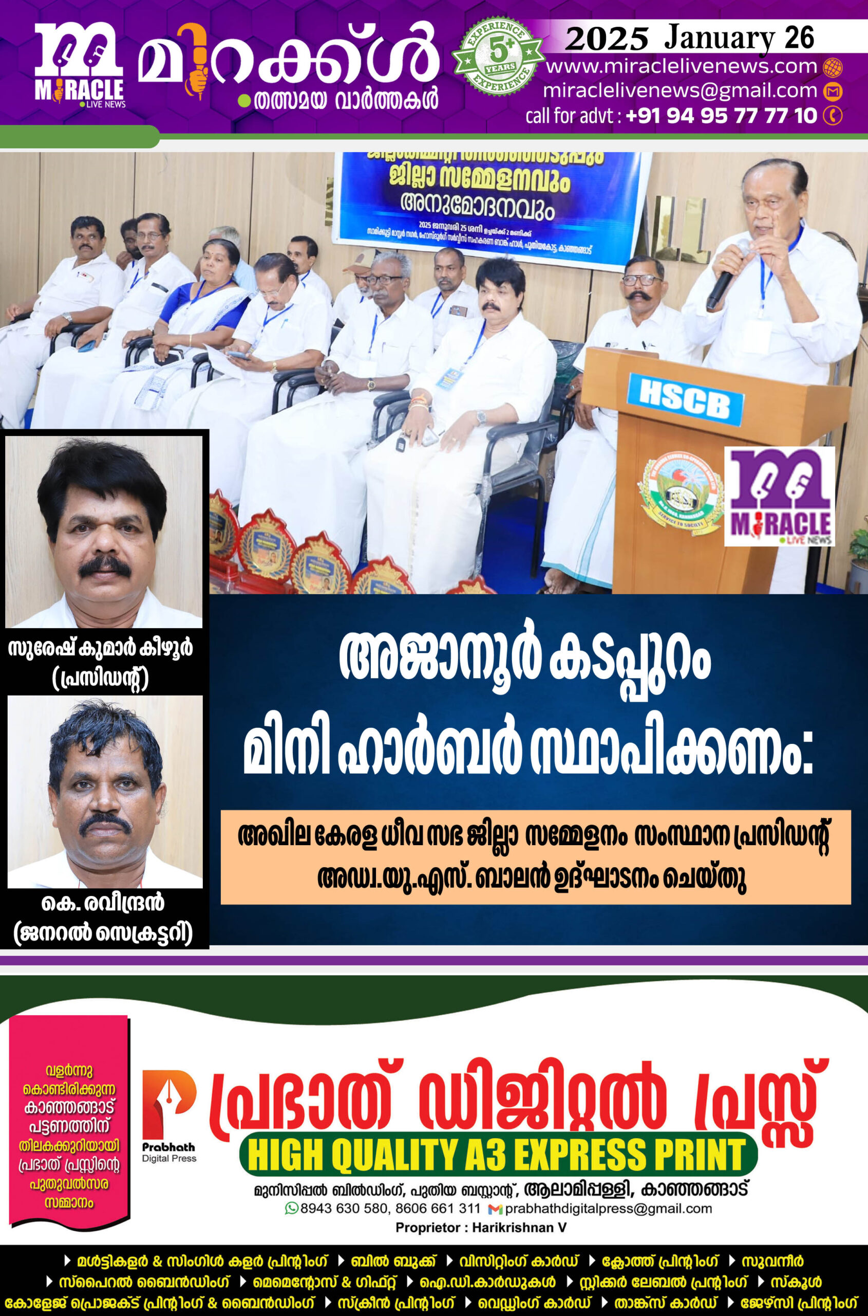 അജാനൂര് കടപ്പുറം മിനി ഹാര്ബര് സ്ഥാപിക്കണം: അഖില കേരള ധീവ സഭ ജില്ലാ സമ്മേളനം സംസ്ഥാന പ്രസിഡന്റ് അഡ്വ.യു.എസ്.ബാലന് ഉദ്ഘാടനം ചെയ്തു