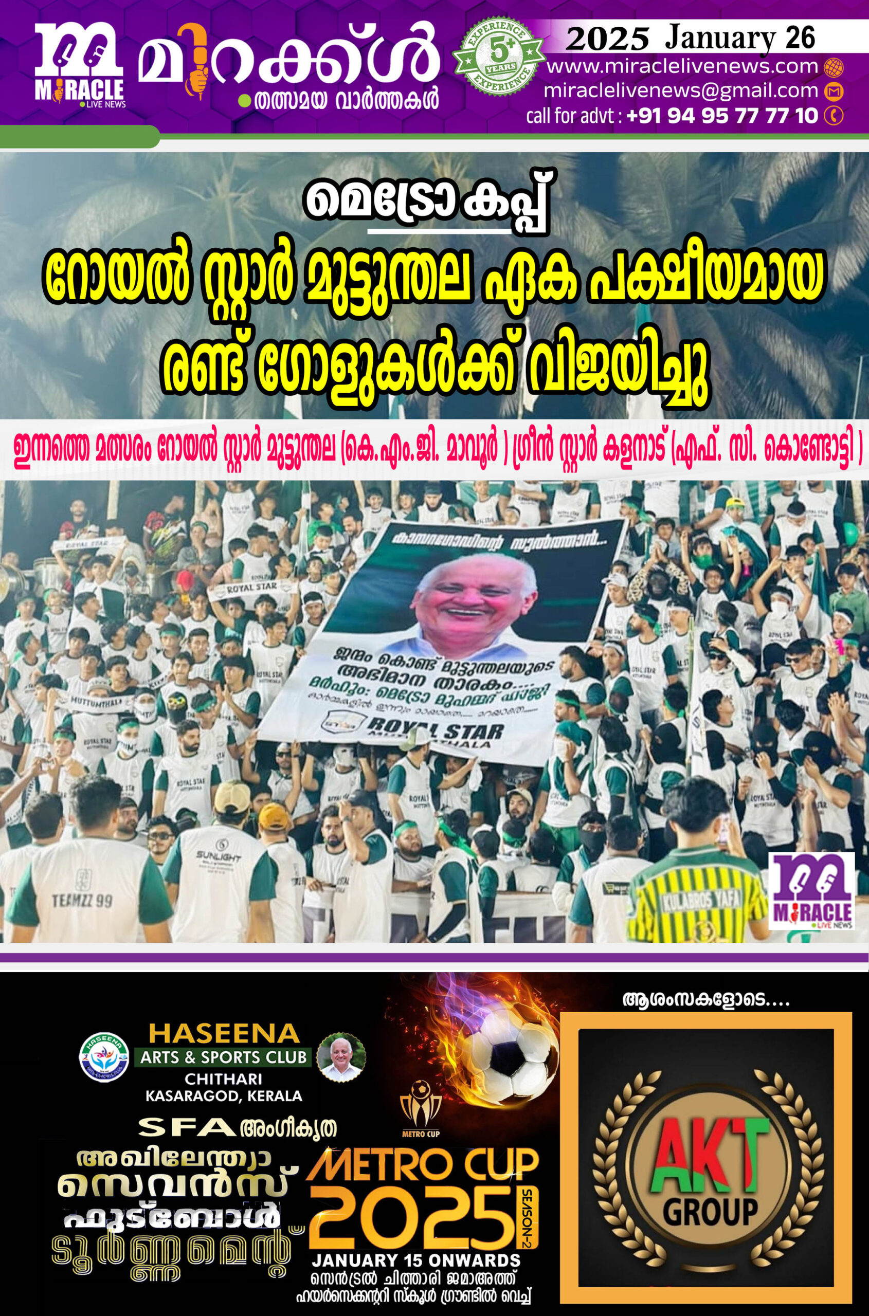 കാഞ്ഞങ്ങാട്: ചിത്താരി ഹസീന ക്ലബ്ബ് സംഘടിപ്പിക്കുന്ന രണ്ടാമത് എസ്.എഫ്.എ അംഗീകൃത മെട്രോ മുഹമ്മദ് ഹാജി അഖിലേന്ത്യ സെവന്സ് ഫുട്ബോള് ഫ്ളഡ് ലൈറ്റ് ടൂര്ണ്ണമെന്റിന്റെ ഇന്നലത്തെ മത്സരത്തില് റോയല് സ്റ്റാര് മുട്ടുന്തല (കെ.എം.ജി മാവൂര് ) അരയാല് ബ്രദേര്സ് അതിഞ്ഞാലിനെ (അഭിലാഷ് എഫ്. സി. കുപ്പൂത്ത് ) ഏക പക്ഷീയമായ രണ്ട് ഗോളുകള്ക്ക് പരാജയപ്പെടുത്തി. കളിയുടെ തുടക്കത്തില് തന്നെ ഇരു ടീമുകളും മല്സരത്തിലുടനീളം ആധിപത്യം പുലര്ത്തിയെങ്കിലും ആദ്യ പകുതിയുടെ 21-ാം മിനുട്ടില് റോയല് സ്റ്റാറിന്റെ ജോണ്സണ് പന്ത് വലയിലാക്കി. രണ്ടാം പകുതിയില് ഇരു ടീമുകളും അറ്റാക്ക് ചെയ്തു തന്നെ കളിച്ചു. അരയാല് ബ്രദേര്സ് ഒന്നാം ഗോളിനരികെ എത്തിയെങ്കിലും പല അവസരങ്ങളും പാഴാക്കി സ്ക്കോര് 1-0 തന്നെ തുടര്ന്നു. രണ്ടാം പകുതിയുടെ 21-ാം മിനിറ്റില് റോയല് സ്റ്റാര് താരം ഹസ്സന് ജൂനിയറിന്റെ വക മറ്റൊരു ഗോള് വലയില് കുടുക്കി വിജയം ഉറപ്പിച്ചു. ഇരു ടീമുകളുടെയും സപ്പോര്ട്ടേഴ്സ് തിങ്ങി നിറഞ്ഞ ഗാലറിയില് ആവേശത്തിന്റെ നേര്ക്കാഴ്ച കൂടിയായിരുന്നു. ഇന്നത്തെ മത്സരം റോയല് സ്റ്റാര് മുട്ടുന്തല (കെ.എം.ജി. മാവൂര് ) ഗ്രീന് സ്റ്റാര് കളനാട് (എഫ്. സി.കൊണ്ടോട്ടി)
