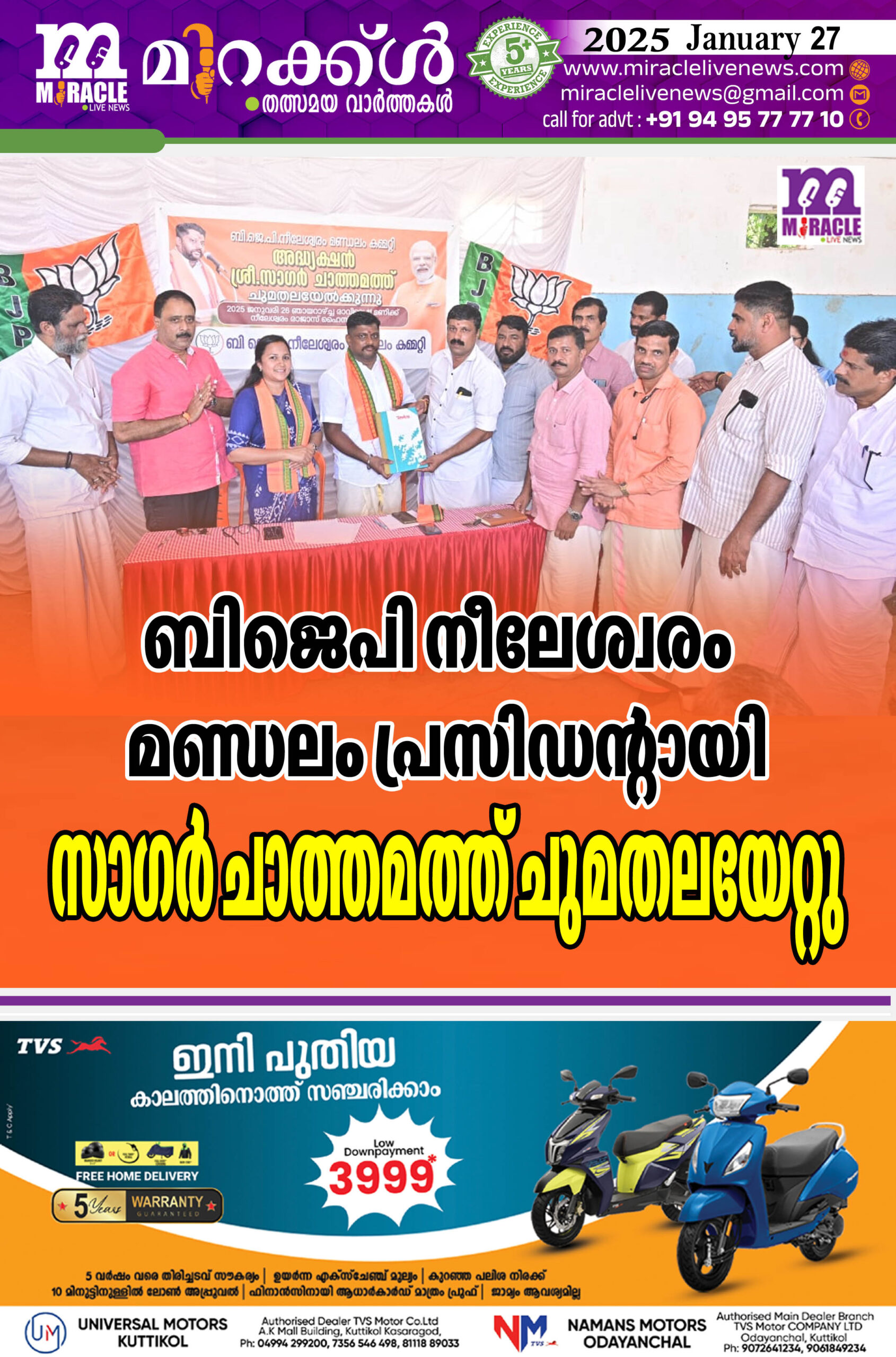 നീലേശ്വരം : നീലേശ്വരം മണ്ഡലം ബിജെപി പ്രസിഡന്റായി സാഗര് ചാത്തമത്ത് ചുമതലയേറ്റു. രാജാസ് ഹൈസ്കൂളില് നടന്ന മണ്ഡലം പ്രവര്ത്തന കണ്വെന്ഷനിലാണ് നിരവധി പ്രവര്ത്തകരെയും നേതാക്കന്മാരെയും സാക്ഷിനിര്ത്തിക്കൊണ്ട് മുന് പ്രസിഡന്റ് സി വി സുരേഷില് നിന്നും സാഗര് ചാത്തമത്ത് പ്രസിഡന്റ് ചുമതല ഏറ്റെടുത്തത്. ബിജെപി ജില്ലാ വൈസ് പ്രസിഡണ്ട് എം ബല്രാജ് കണ്വെന്ഷന് ഉദ്ഘാടനം ചെയ്തു. നിയുക്ത ജില്ലാ പ്രസിഡന്റ് എം എല് അശ്വിനി , ജില്ലാ ഐടി സെല് കോഡിനേറ്റര് എന് ബാബുരാജ് , കാഞ്ഞങ്ങാട് മണ്ഡലം പ്രസിഡന്റ് എം പ്രശാന്ത് , കാഞ്ഞങ്ങാട് നഗരസഭ കൗണ്സിലര് എന് അശോക് കുമാര്, ബി എസ് സംസ്ഥാന സമിതി അംഗം വി.വി.ബാലകൃഷ്ണന്, മഹിളമാര്ച്ച മണ്ഡലം പ്രസിഡന്റ് ജയന്തി ജയരാജ് എന്നിവര് സംസാരിച്ചു. മണ്ഡലം ജനറല് സെക്രട്ടറി രാജീവന് ചീമേനി സ്വാഗതവും സാഗര് ചാത്തമത്ത് നന്ദിയും പറഞ്ഞു.